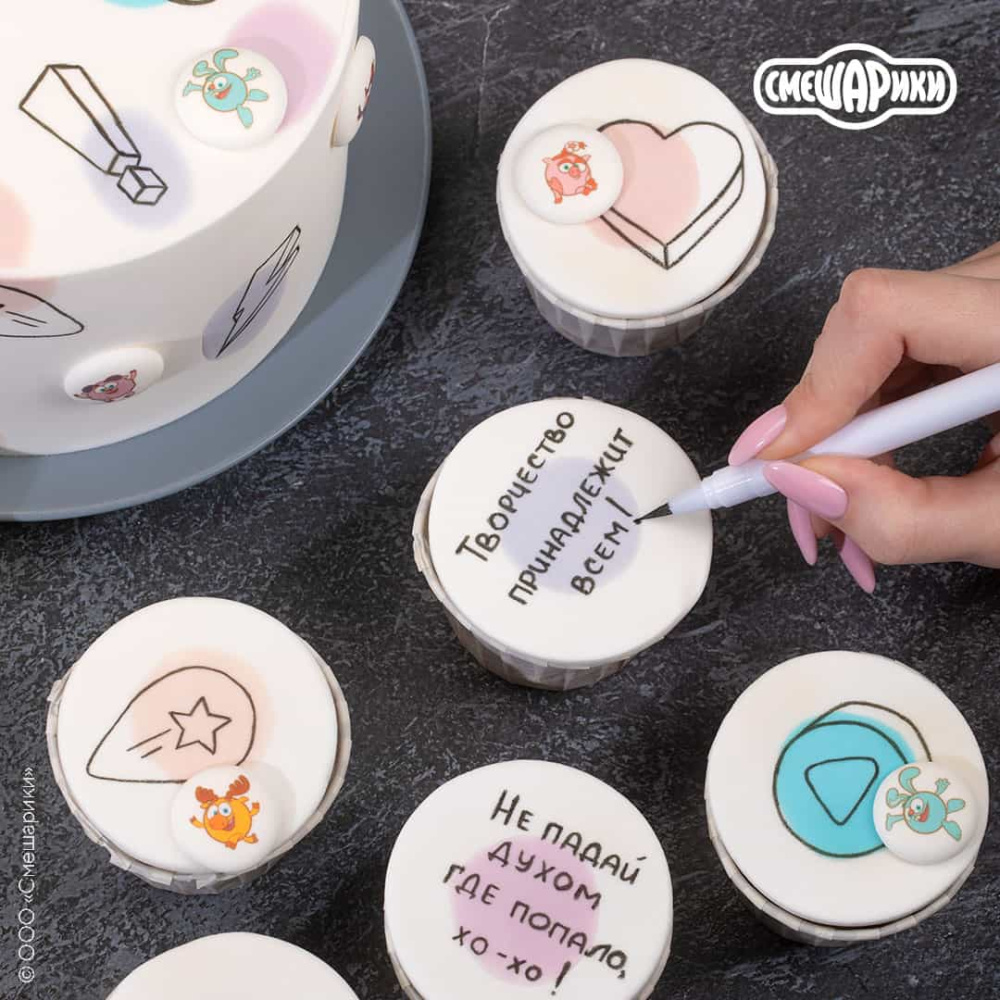 Идея декорирования "Десерты со Смешариками" представляет собой капкейки, украшенные сахарными медальонами "Смешарики Стикербомбинг" в стиле известного мультика "Смешарики". На изображении видно, что капкейки дополнительно украшены различными фразами из мультика, которые нанесены с помощью пищевых фломастеров.