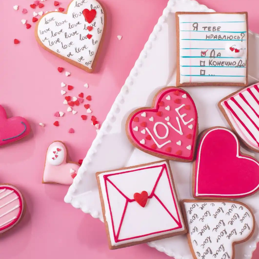 Идея "Для нежных посланий" представляет собой замечательный способ выразить свои чувства близким людям. На изображении мы видим пряники в форме сердец, каждый из которых украшен айсингом в разных оттенках красителя "Электрический розовый" от компании Top Decor. Каждый пряник станет незабываемым символом нежности и заботы.