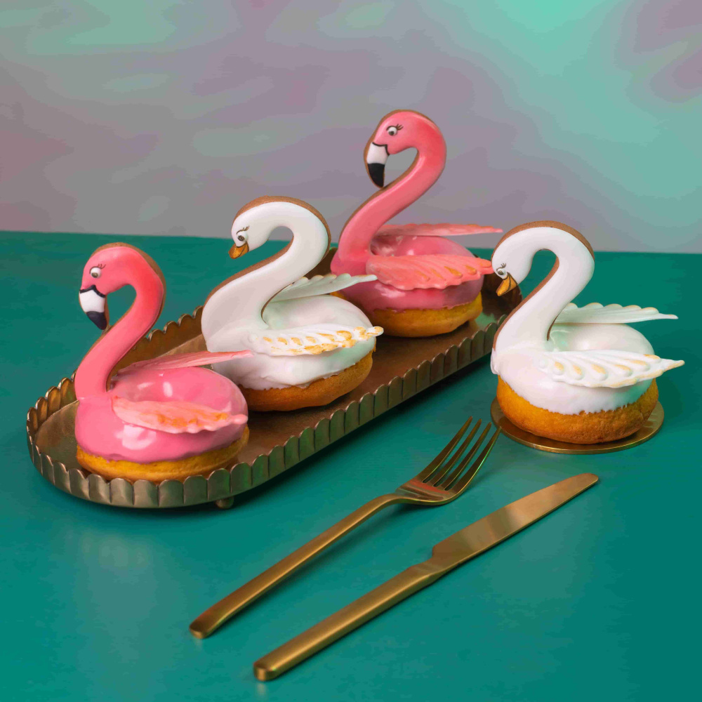 Идея декорирования "Лебедь и Фламинго" - это оригинальное и запоминающееся кондитерское изделие. На изображении к идее вы можете увидеть пончики, оформленные в виде лебедя и фламинго. Для создания голов лебедя и фламинго используется вырезанный пряник, который покрывается айсингом и разрисовывается черным фломастером. Оформление пончиков в виде птиц позволит придать им яркий и необычный вид, который обязательно понравится вашим клиентам. Для изготовления пончиков-фламинго и пончиков-лебедей вам понадобятся специальные формы для выпечки, а также кондитерский декор в виде помадки и айсинга.
