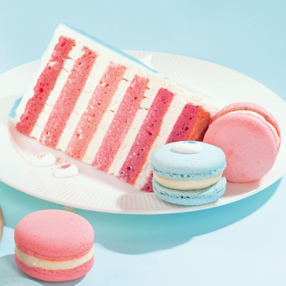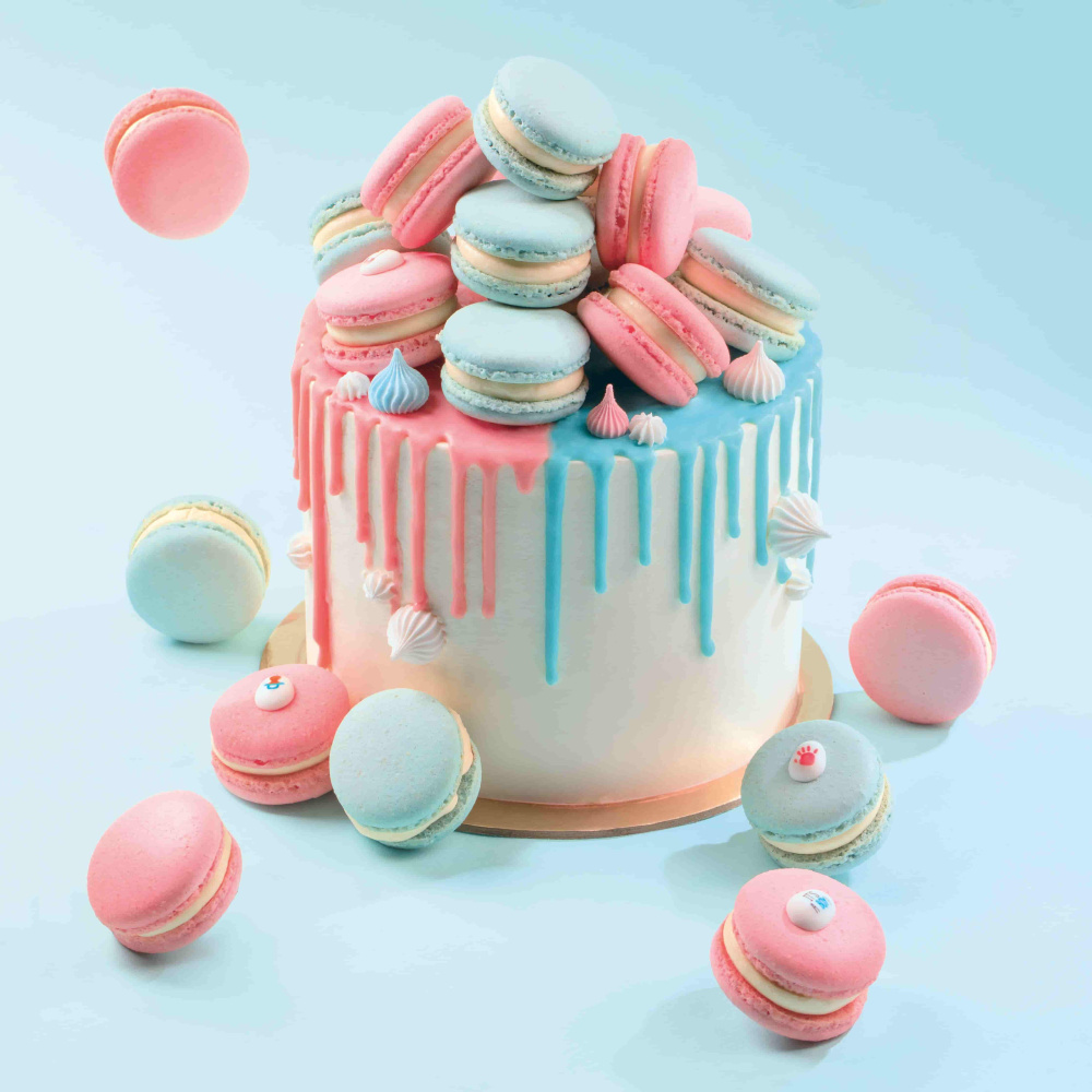 Представляем вам идею декорирования под названием "Gender party". На изображении вы можете увидеть торт и макаронс, окрашенные в яркие цвета из весенней коллекции 2022 года от Top Decor.