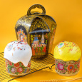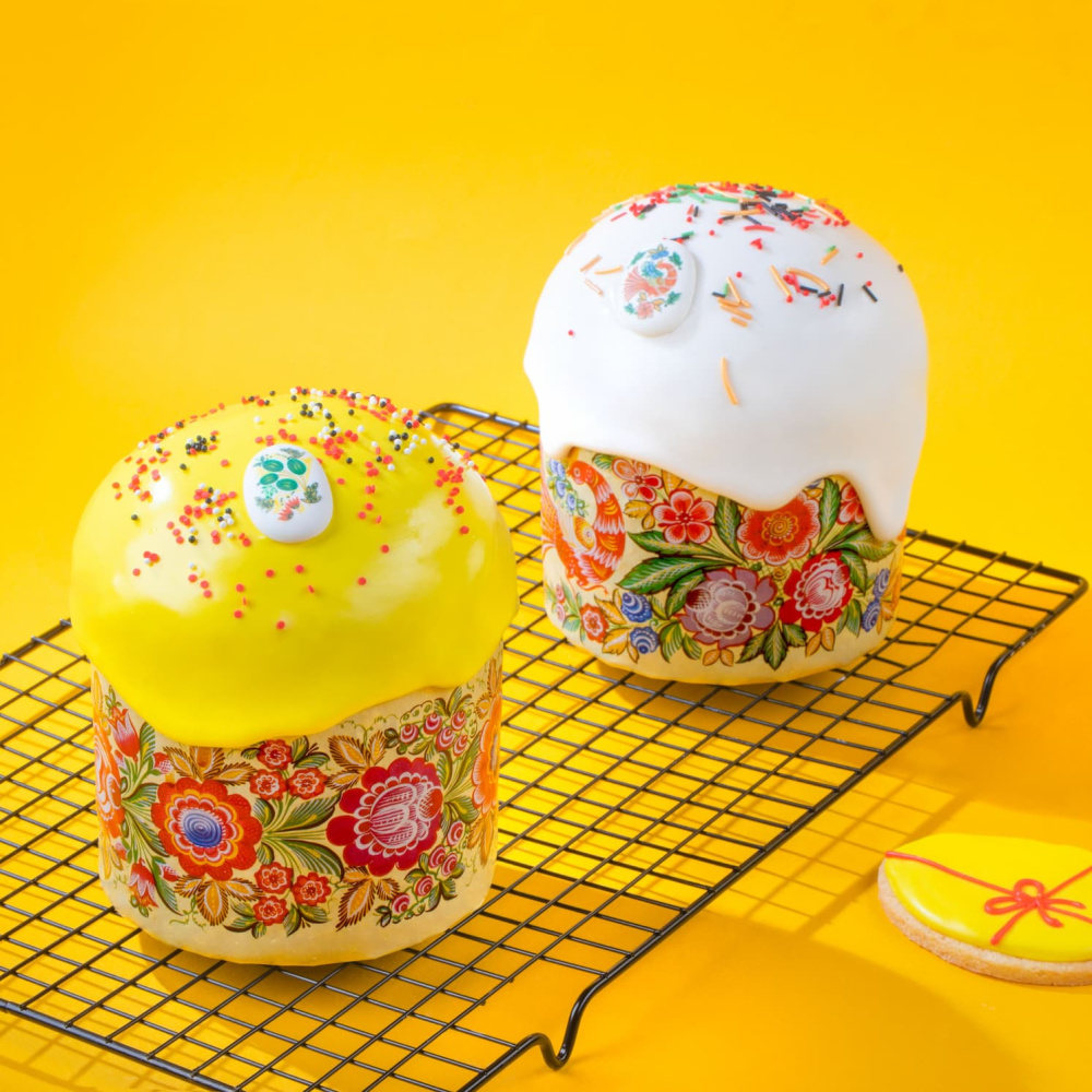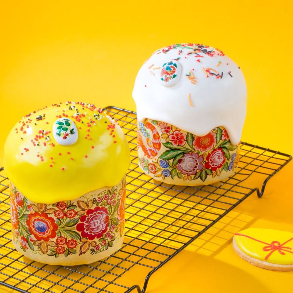 Куличи покрыты белой и жёлтой помадкой, а сверху украшены различными посыпками от компании Top Decor. Среди украшений можно найти сахарные медальоны "Русские узоры" и вафельные картинки "Городец".