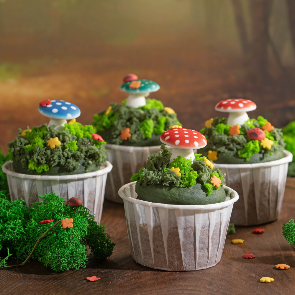 Идея декорирования “Лесная опушка” представляет собой капкейки, вдохновленные красотой осеннего леса, в основании капкейков мы создали эффект мха с использованием зеленого красителя Top Decor. Грибочки на пирожных являются готовым сахарным декором, доступным для приобретения в нашем интернет-магазине. Эта идея добавит оригинальности вашему десерту и создаст естественную атмосферу леса.