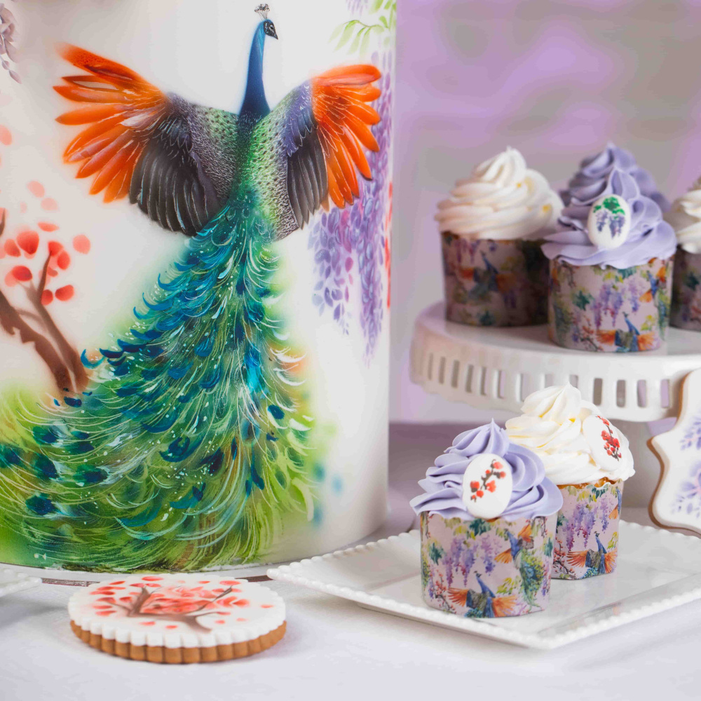 Идея декорирования "Кексы с павлинами" представляет из себя оригинальный способ украшения кексов. Кексы готовятся в формах с изображением павлинов, которые придают кексам неповторимый вид. Сверху кексы покрываются кремом и украшаются сахарными медальонами "Павлины" от компании Top Decor. Эта идея позволит удивить гостей и придать торжественный вид любому мероприятию. Для ее реализации понадобятся куличные формы "Павлины", крем для украшения и сахарные медальоны "Павлины" от Top Decor.