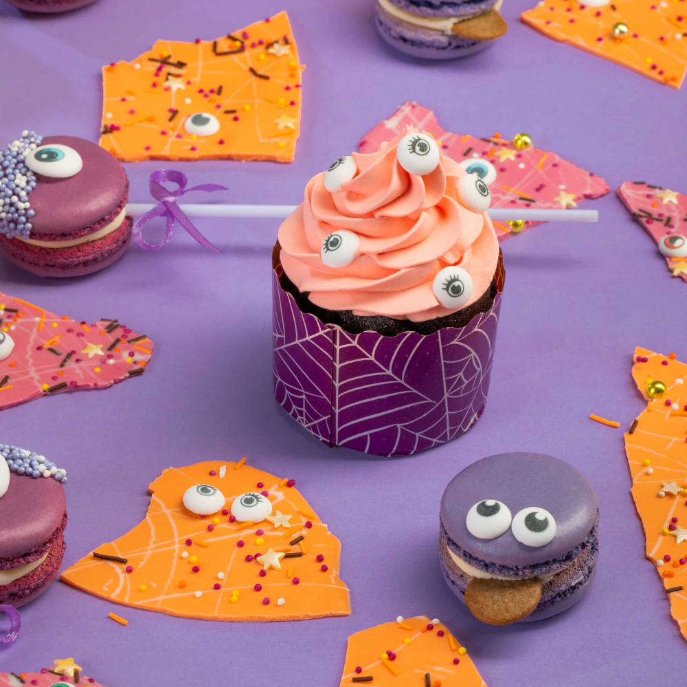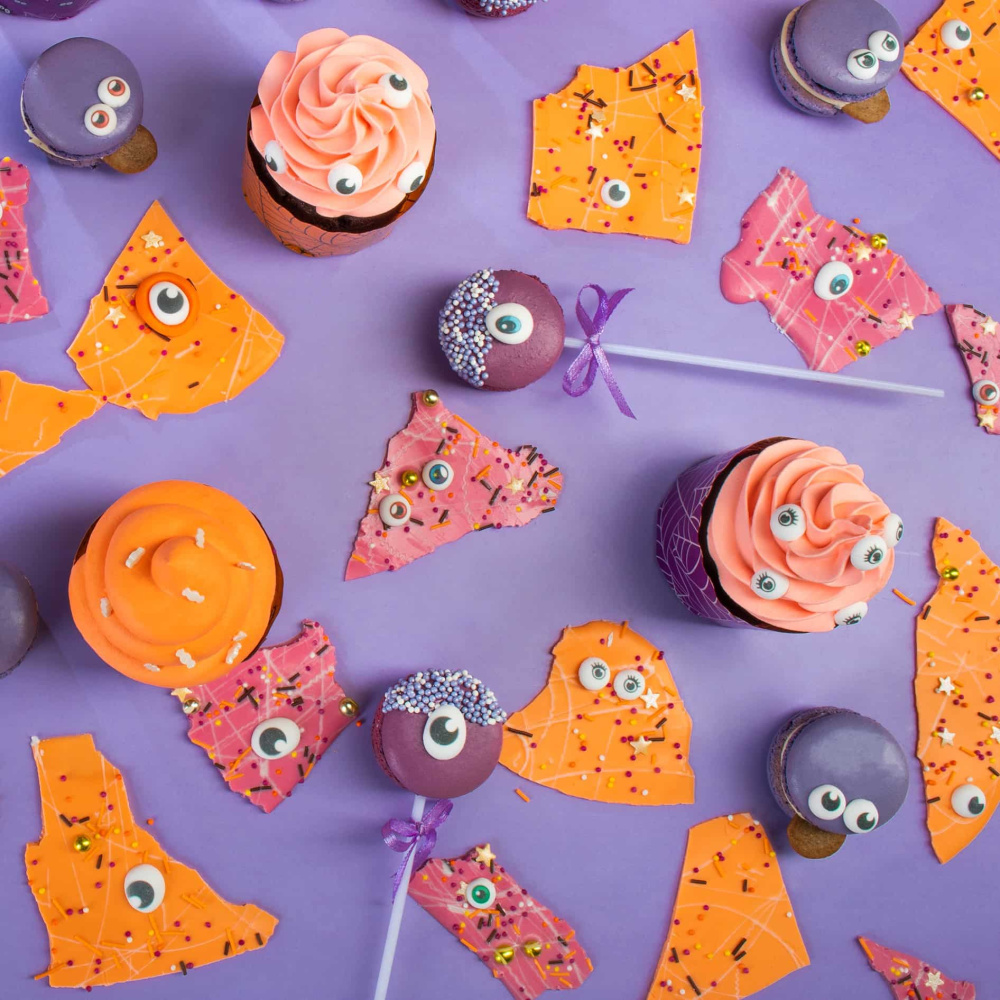 Для создания атмосферы Хэллоуина все десерты также украшены черными посыпками в виде летучих мышей, вермишели и шариков. Эти декоративные элементы добавляют десертам нотку таинственности и создают эффектный визуальный эффект. Все десерты получают яркость и насыщенность благодаря использованию пищевых красителей в оранжевом и фиолетовом цветах.