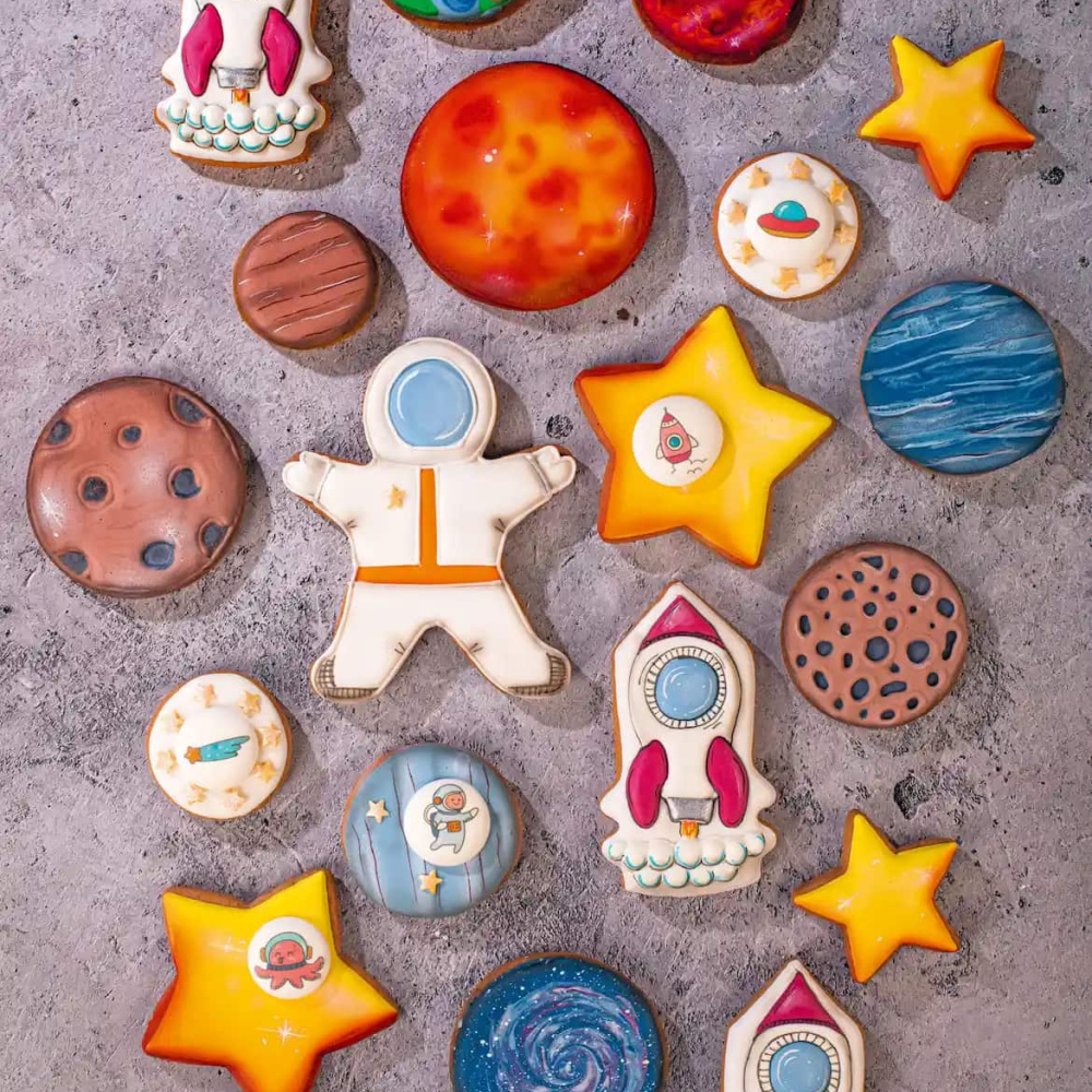 Идея "Космос и звезды" привнесет в ваши десерты частичку магии и фантазии. Пряники в форме космонавта, планет, ракеты и звезд покрыты яркими и насыщенными оттенками айсинга, созданными с помощью уникальных красителей от Top Decor. А для того, чтобы добавить космического настроения, мы использовали яркие пищевые красители для аэрографа - красный и желтый, которые позволили создать реалистичный эффект атмосферы на некоторых планетах. Часть пряников украшена сахарным медальоном "Время приключений" от компании Top Decor, который добавляет немного веселого приключенческого духа. Отправьтесь в космическое путешествие с этой идеей декорирования десертов от Top Decor!