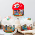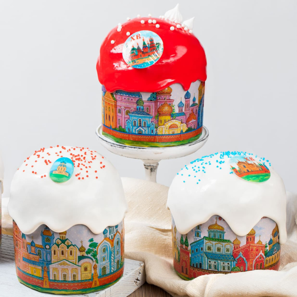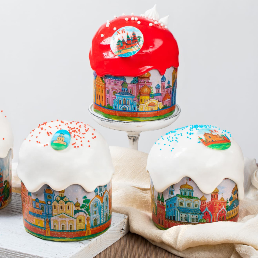Куличи "Кремли" - это не просто пасхальные куличи, это настоящие произведения искусства. Каждый кулич украшен яркими посыпками и вафельными картинками "Пасха Ретро", а также иллюстрациями зданий Кремля на бумажной форме. Белая и красная помадка, покрывающая куличи, добавляет яркости и насыщенности.