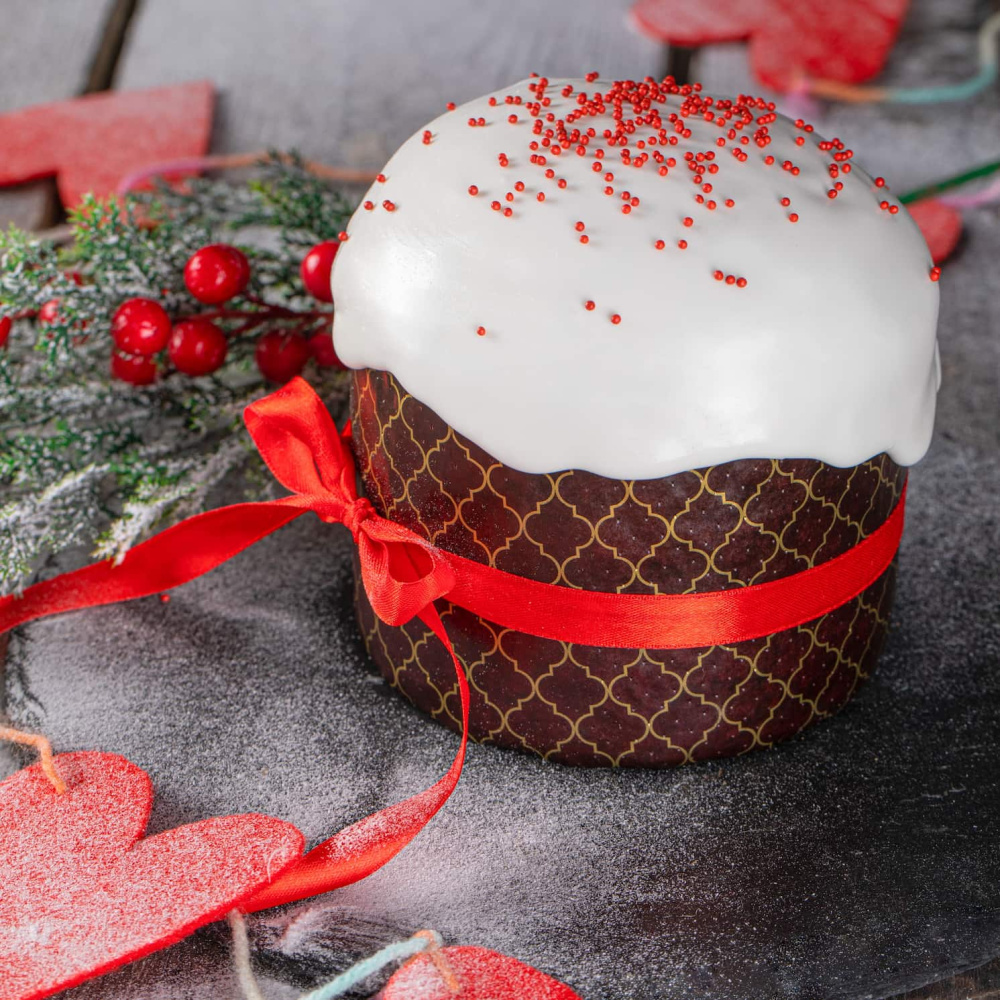 Идея "Купола" представляет собой изысканные куличи и маффины, поданные в минималистичной бумажной форме. Декор куличей включает в себя белую помадку и посыпку "Красные шарики" Top Decor, придающую им элегантный вид. В таком декоре куличи "Купола" будут отличным угощением на любом торжестве или вечеринке.