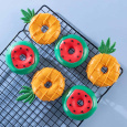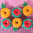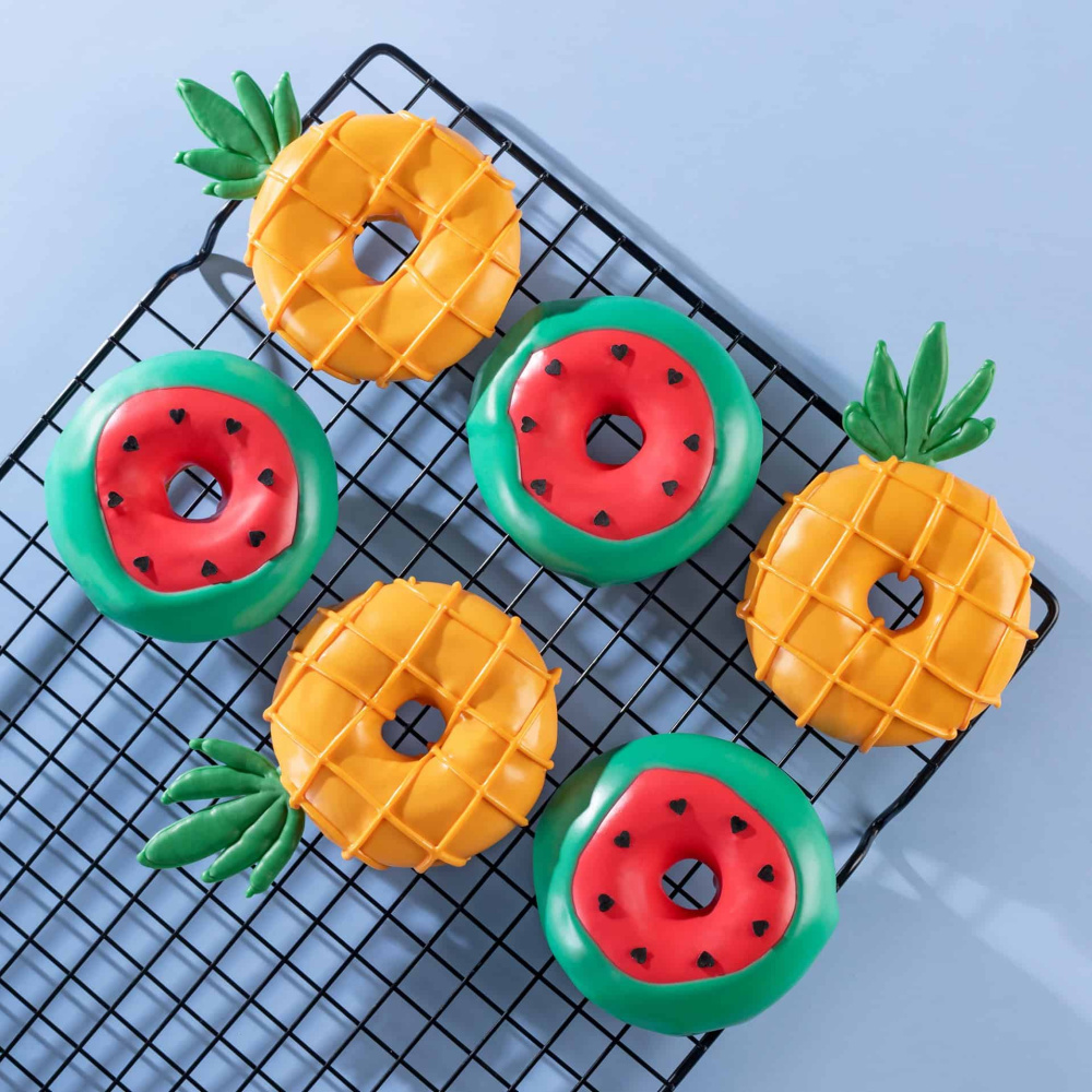 Идея декорирования "Летние пончики" представляет собой пончики, которые имитируют арбузы и ананасы. Пончики покрыты сладкой сахарной помадкой, которая окрашена в яркие летние оттенки с использованием пищевых красителей Top Decor. Этот декор добавляет визуальное разнообразие и создает летнее настроение. Эти пончики станут прекрасным дополнением к любому летнему мероприятию или вечеринке, а также будут радовать глаз и поднимать настроение вашим гостям.