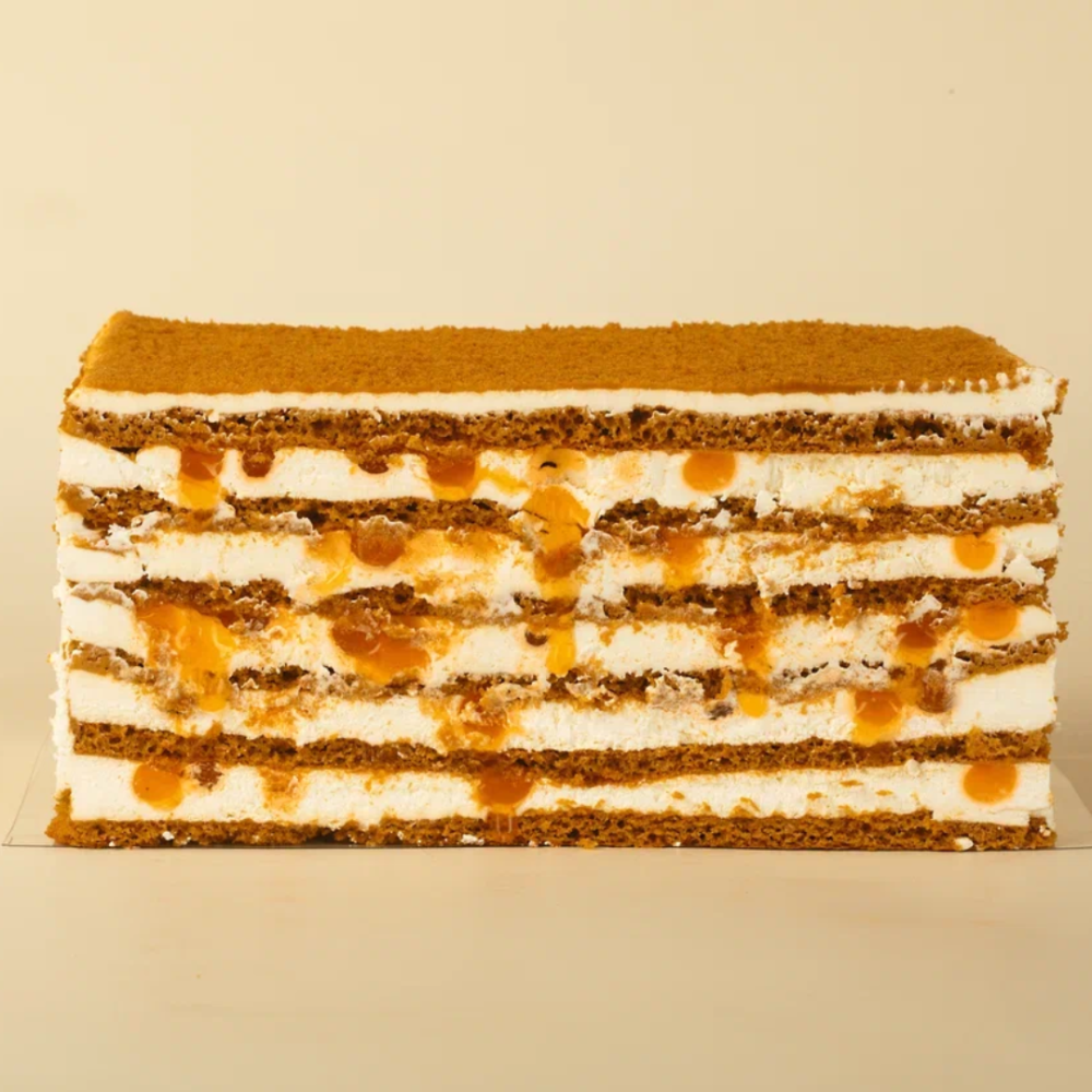 Медовик с джус бабл — это современная интерпретация любимой классики. Мягкие мёдовые коржи и нежный сливочный крем остаются в основе, но теперь к ним добавляется неожиданный акцент — лопающиеся шарики со вкусом морошки.