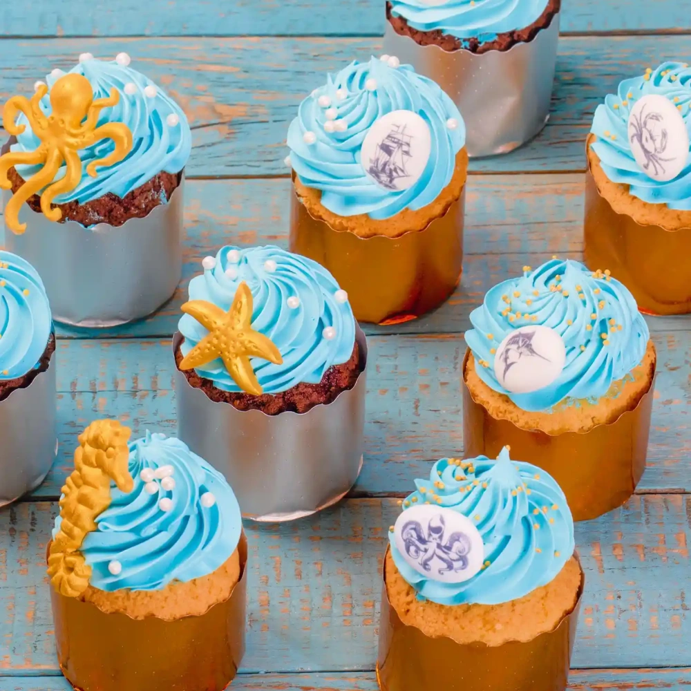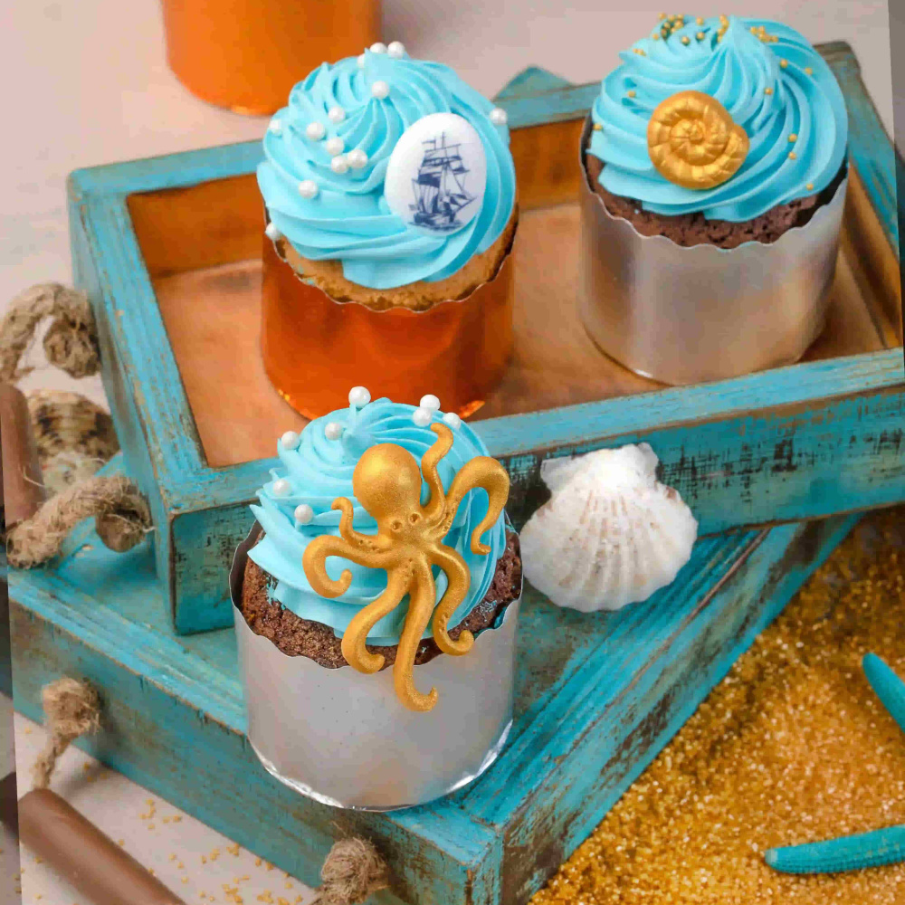 Капкейки в морской тематике - это прекрасная идея для тех, кто любит морскую жизнь и желает погрузиться в атмосферу моря. Каждый капкейк является уникальным и содержит различные детали декора, которые идеально передают морскую тематику. Сахарные медальоны и фигурки, такие как осьминог, ракушки, морские звезды и коньки, дополняют общую концепцию десерта.