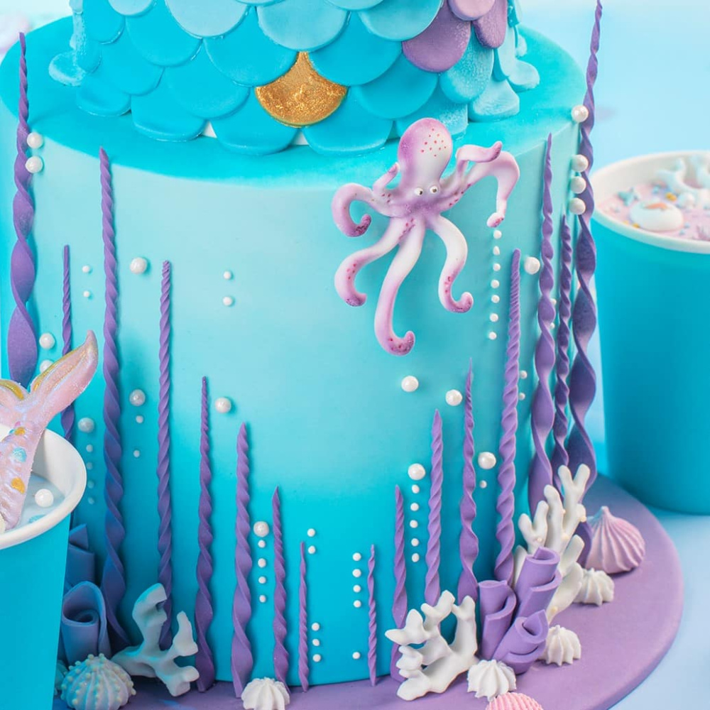 Особое внимание уделяется деталям декора. Торт украшен сахарными мини-безе, которые добавляют текстуру и игривость. Фигурки из мастики, представляющие морских обитателей, придают торту особый шарм и создают впечатление подводного мира. Разнообразные посыпки от Top Decor дополняют декор и добавляют яркие акценты.