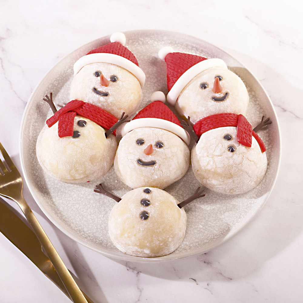 Предлагаем придать моти новогоднюю атмосферу и украсить их в виде снеговиков. Для создания тонких элементов виде шапочки, шарфика, ручек и носа в виде морковки используете сахарную мастику Top Decor.