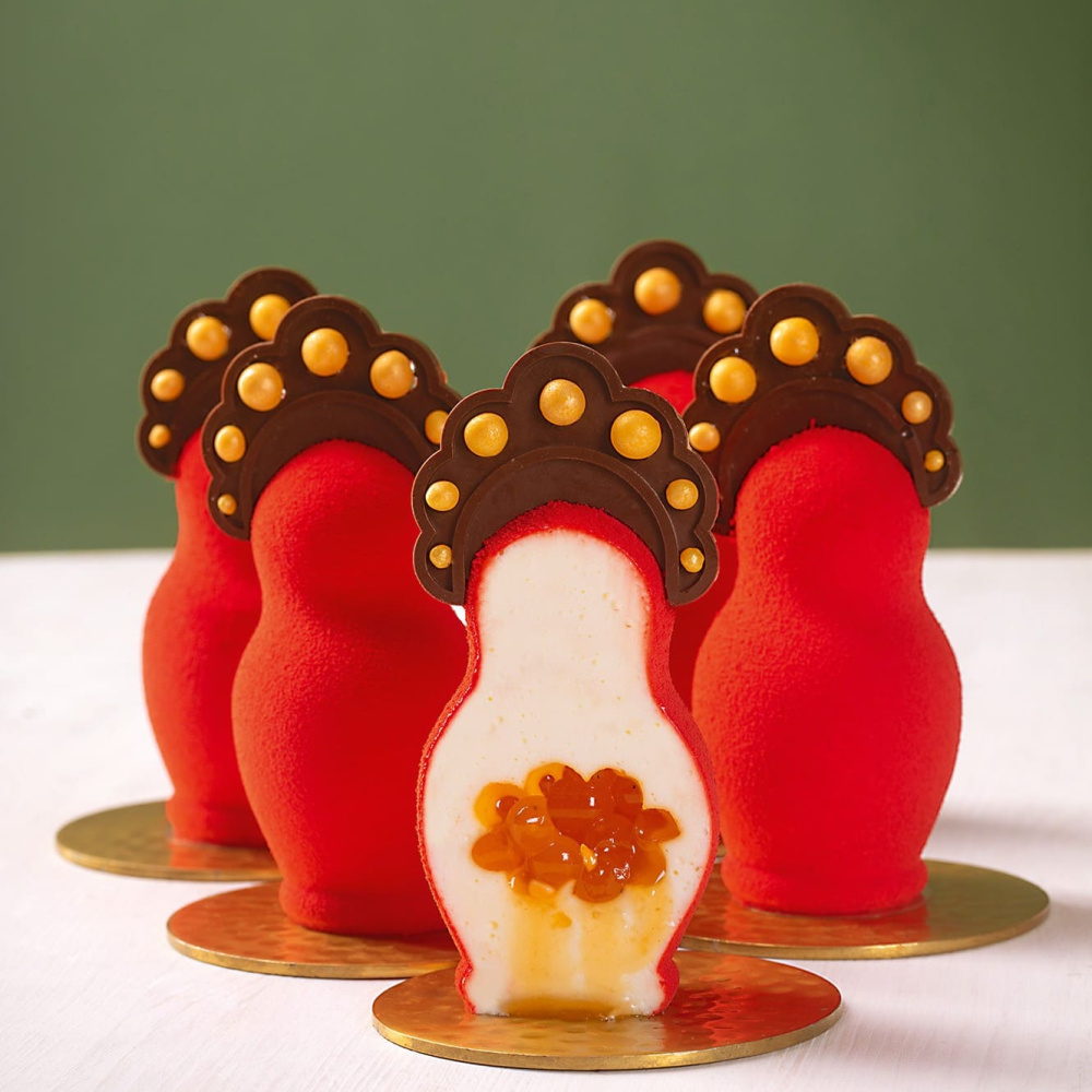 Для декора использован золотой жемчужный микс Top Decor, а яркий красный цвет матрешки достигнут с помощью жирорастворимого красителя. Такой десерт сочетает визуальную эффектность, необычную форму и традиционные вкусовые ноты, создавая стильное и праздничное угощение для ваших клиентов.
