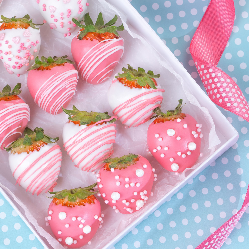 Клубника покрыта новой жиросодержащей помадкой помадкой Top Decor, а также украшена сахарным декором в нежных оттенках и посыпками в виде розовых перламутровых шариков. Такая идея придется по душе каждой девушке и подарит ей самые теплые и незабываемые эмоции.