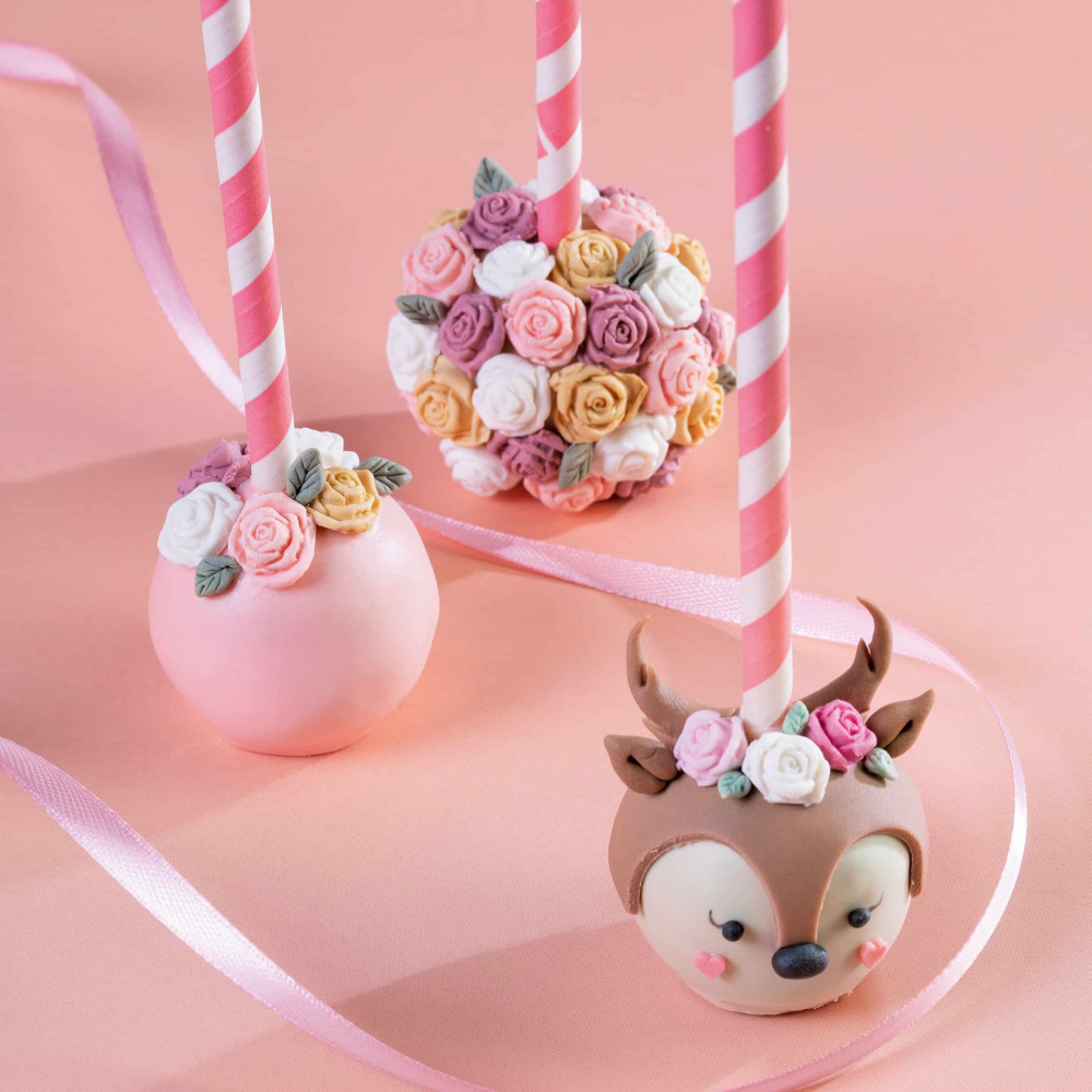 Третий кейк попс выполнен в виде олененка из мастики, окрашенной в кофейный цвет, и разноцветных цветов из мастики Top Decor. Этот кейк попс станет замечательным акцентом и добавит уникальности вашему мероприятию.