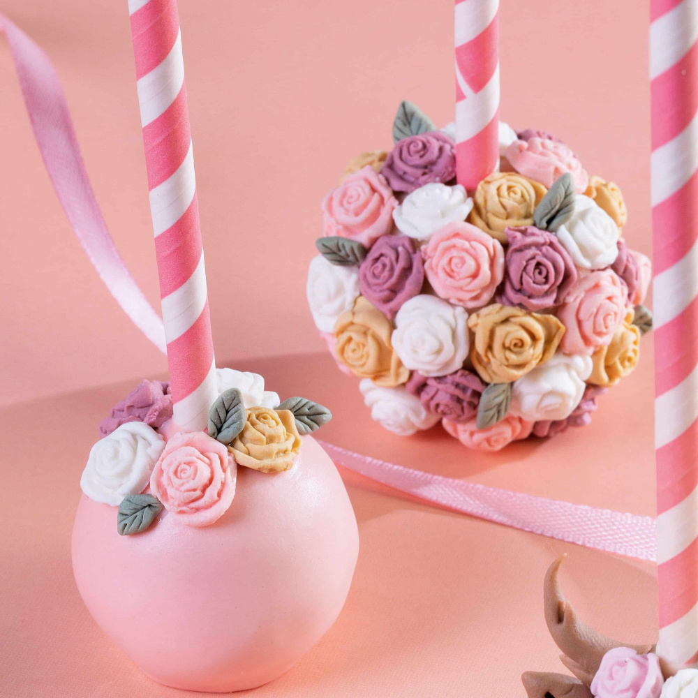 Два кейк попса украшены с помощью готовой розовой помадки и цветов из мастики, что добавляет им изысканности и привлекательности. Они станут великолепным лакомством для вашего стола.