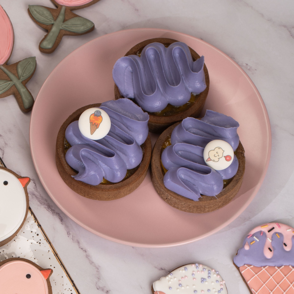 Дополните этот нежный десерт кремом, который придаст ему еще больше изыска. Мы рекомендуем использовать наш летний пищевой краситель "Фиолетовый" и украсить десерт готовым сахарным медальоном "Время приключений". Это добавит десерту элегантности и уникальности.
