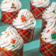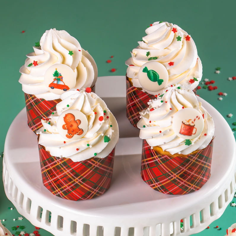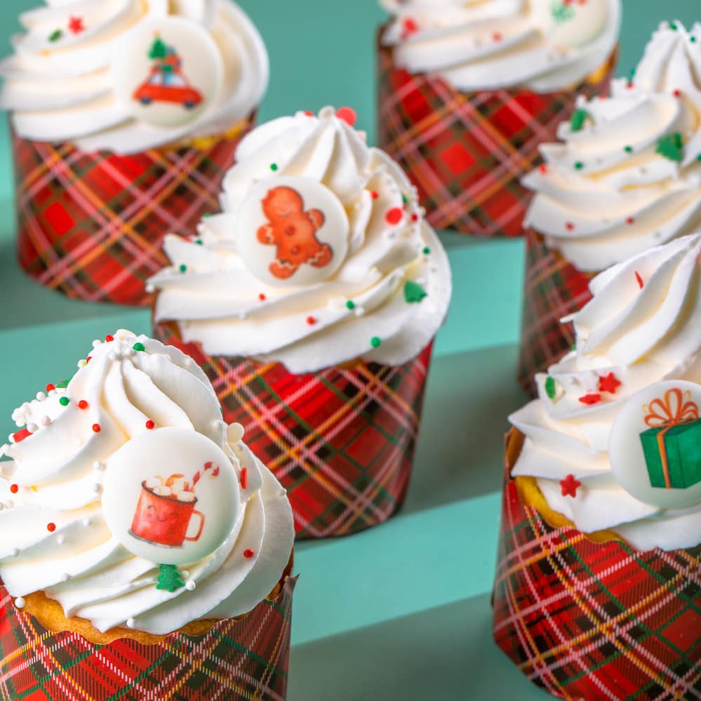 Идея декорирования "Новогодние капкейки" представляет собой капкейки, выполненные в оттенках зимней коллекции Top Decor, специально для празднования Нового года. На изображении видно, что капкейки украшены сахарными медальонами "Рождество" и различными посыпками от Top Decor.