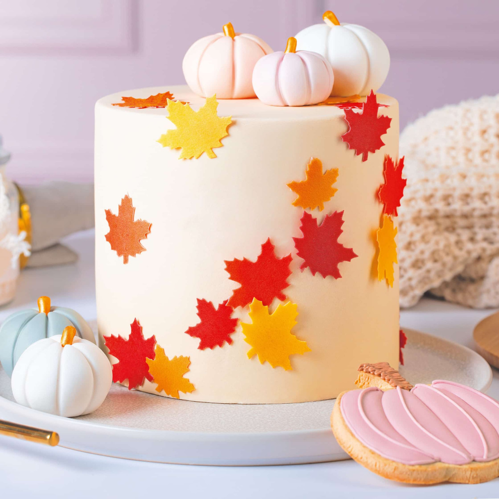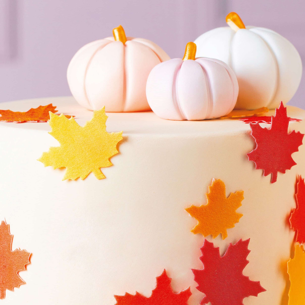 Основным элементом украшения этого торта являются готовые вафельные листья клена в оранжевых и желтых оттенках. Вы можете приобрести эти листья в нашем интернет-магазине и легко использовать их для создания осенней атмосферы на своем торте. Дополнительным украшением сверху торта являются самодельные тыквочки из мастики.