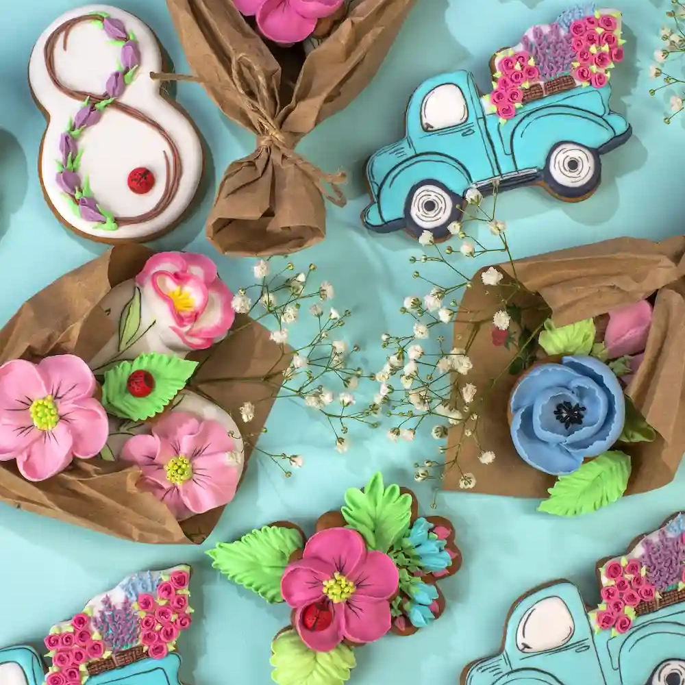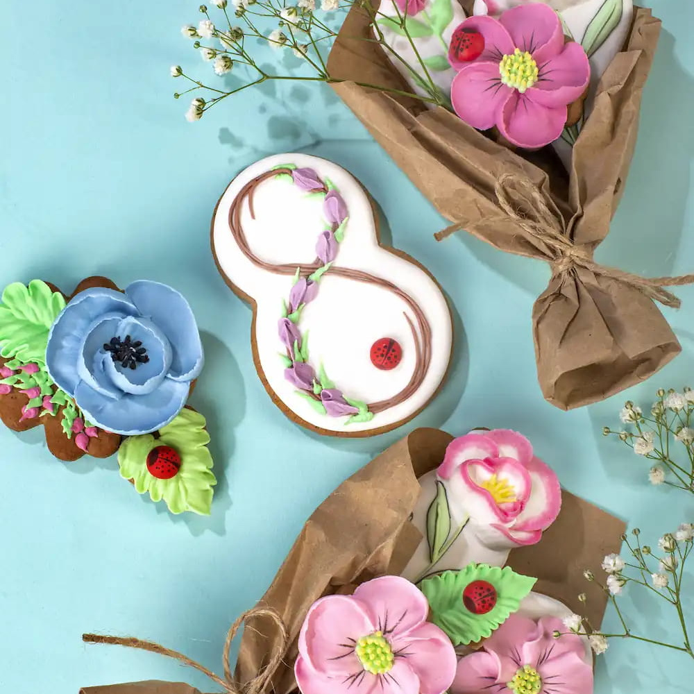 Предлагаемая идея "Печенье к 8 марта" - это отличный подарок на женский праздник. Печенье выполнено в форме восьмерки, символизирующей бесконечность и женственность, а также в виде красочных букетов из другого печенья. Каждый элемент украшен айсингом и гелевыми красителями Top Decor, создавая неповторимый и яркий дизайн.
