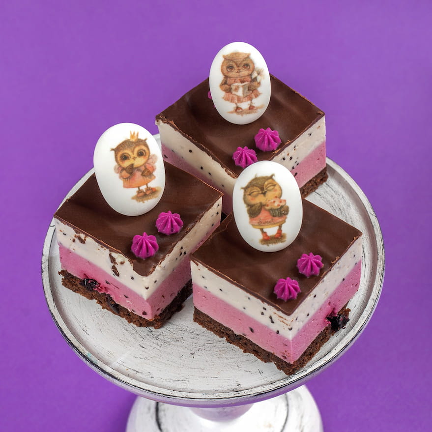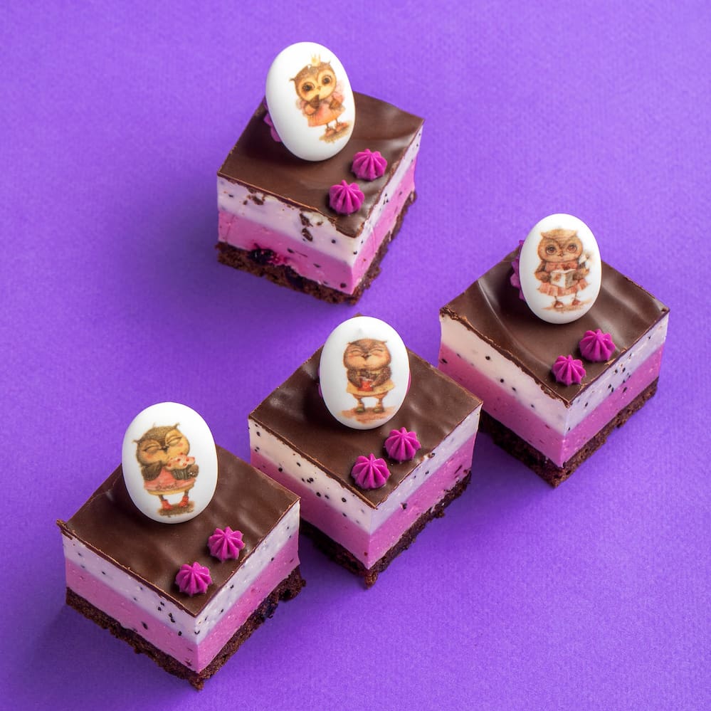 Идея декорирования "Пирожные с совушками" представляет собой порционные десерты, украшенные сахарными медальонами с изображением совушек. На идее видно, что каждый десерт украшен медальоном, изображающим милых и очаровательных совушек. Эти сахарные медальоны придают пирожным игривый и привлекательный вид. Кроме того, десерты украшены сиреневыми мини-безе, что добавляет им дополнительного цветового контраста и текстуры. Идея декорирования "Пирожные с совушками" подходит для различных мероприятий, таких как детские праздники, дни рождения или тематические вечеринки, где можно порадовать гостей вкусными и красивыми десертами.