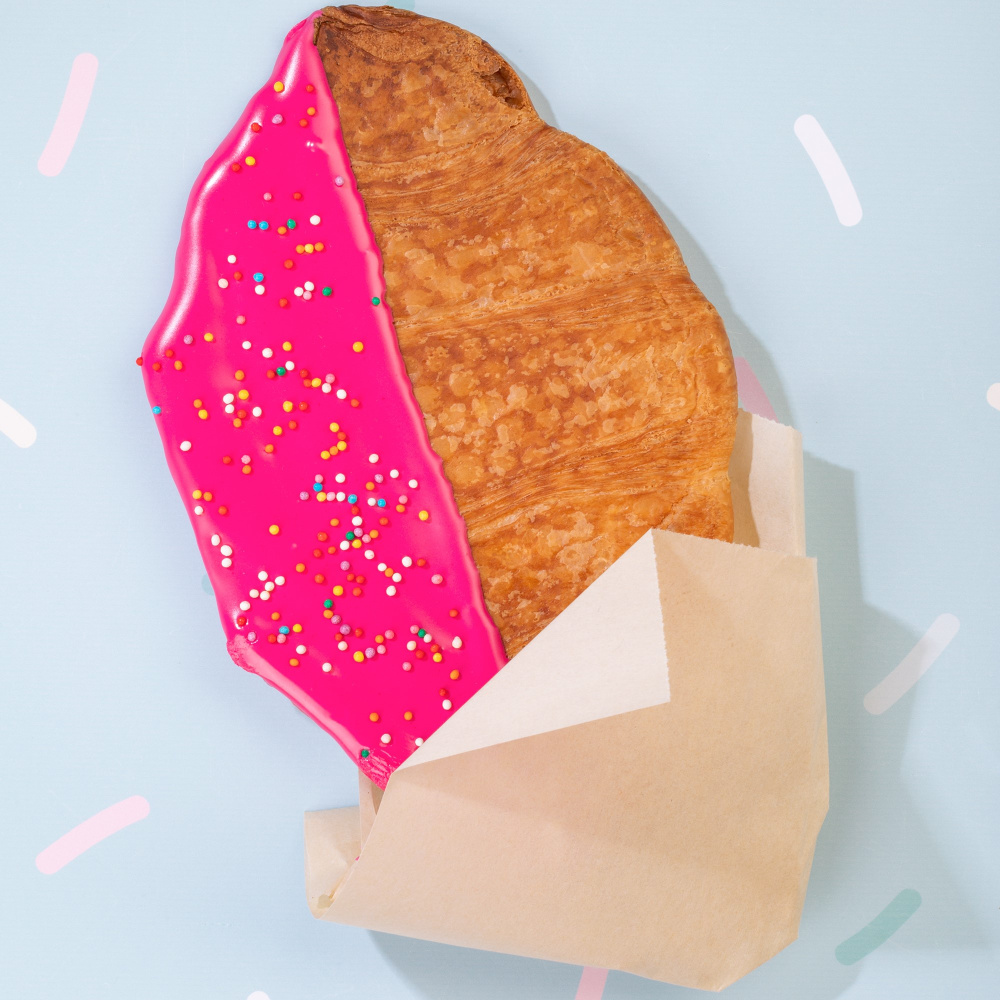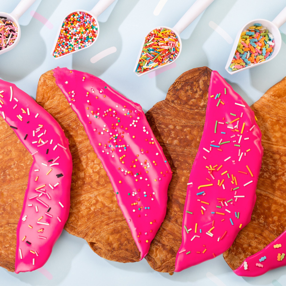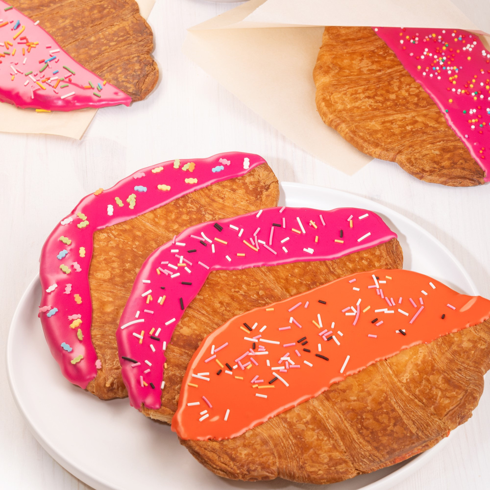 Такие круассаны дают большее разнообразие для экспериментов со вкусами и декором. В нашей идее декорирования на фото вы можете заметить круассаны, украшенные сахарной помадкой оранжевого и пурпурного цветов, а также яркими посыпками в виде разноцветой вермишели и конфеток.