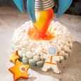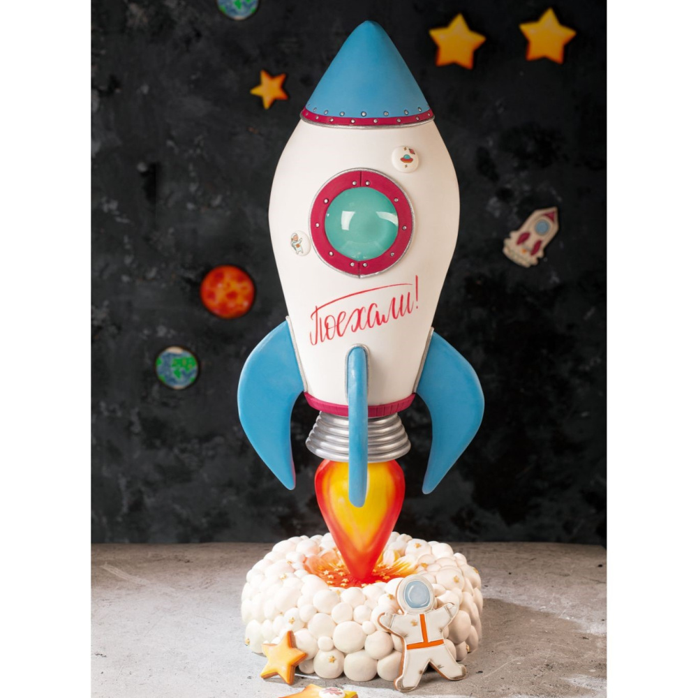 Идея "Поехали!" представляет собой космическую тематику в виде торта в форме ракеты. Главным элементом декора является мастика и мальтит, с помощью которых была выполнена форма ракеты. Рядом с тортом мы видим пряничного космонавта, который приземлился на землю и готов отправиться в следующее приключение.