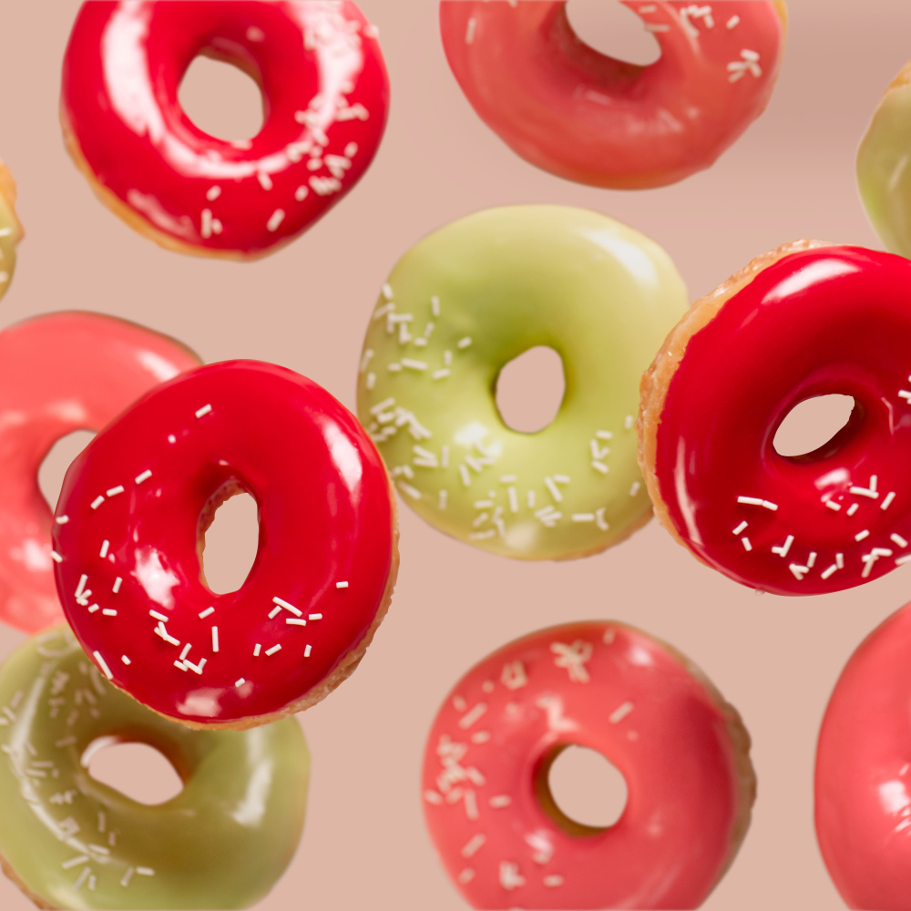 Идея декорирования «Весенние пончики» представляет собой ассортиментную линейку пончиков, покрытых вкусовой сахарной помадкой Top Decor в нежных весенних оттенках. В коллекции представлены вкусы: фисташка, малина и клубника, которые подчёркивают свежесть и лёгкость десерта.
