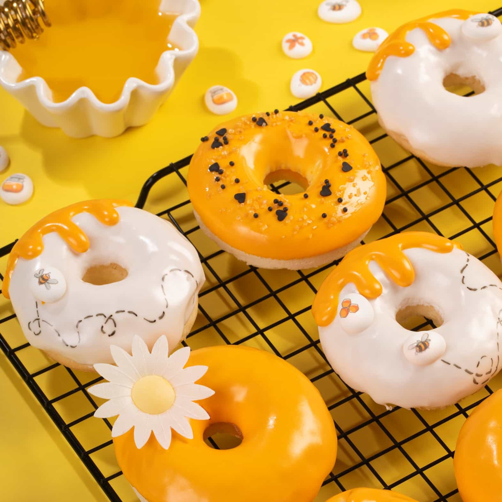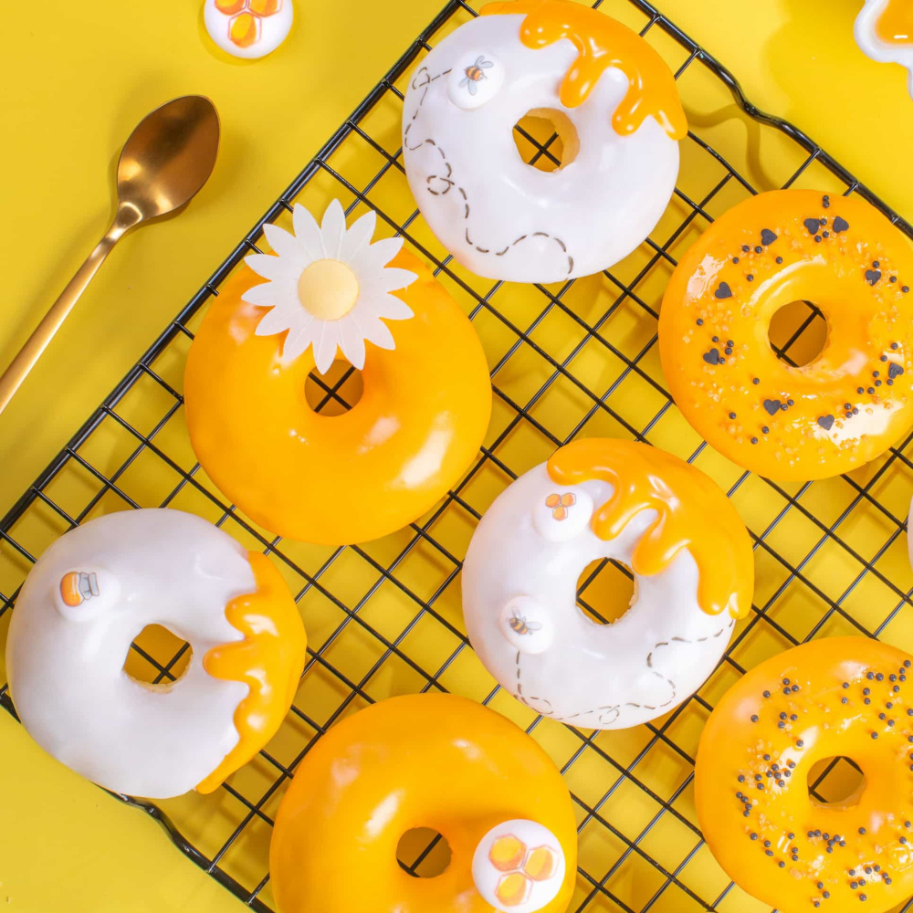 Идея декорирования "Пончики в стиле "Мед"" представляет собой пончики, покрытые сладкой помадкой в цвете меда. Они украшены сахарными мини-медальонами "Медовик" и медальонами "Мед", придающими им особый шарм. Этот вариант пончиков в стиле "Мед" идеально подходит для любителей сладких десертов, предлагая сочный вкус и привлекательный внешний вид с узнаваемыми элементами медовой тематики.