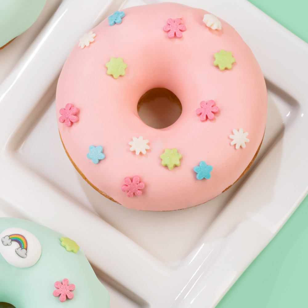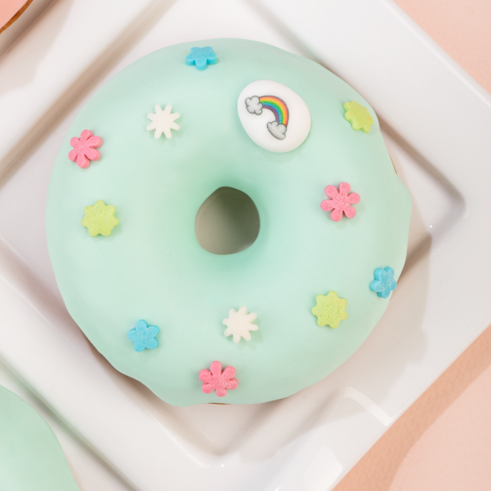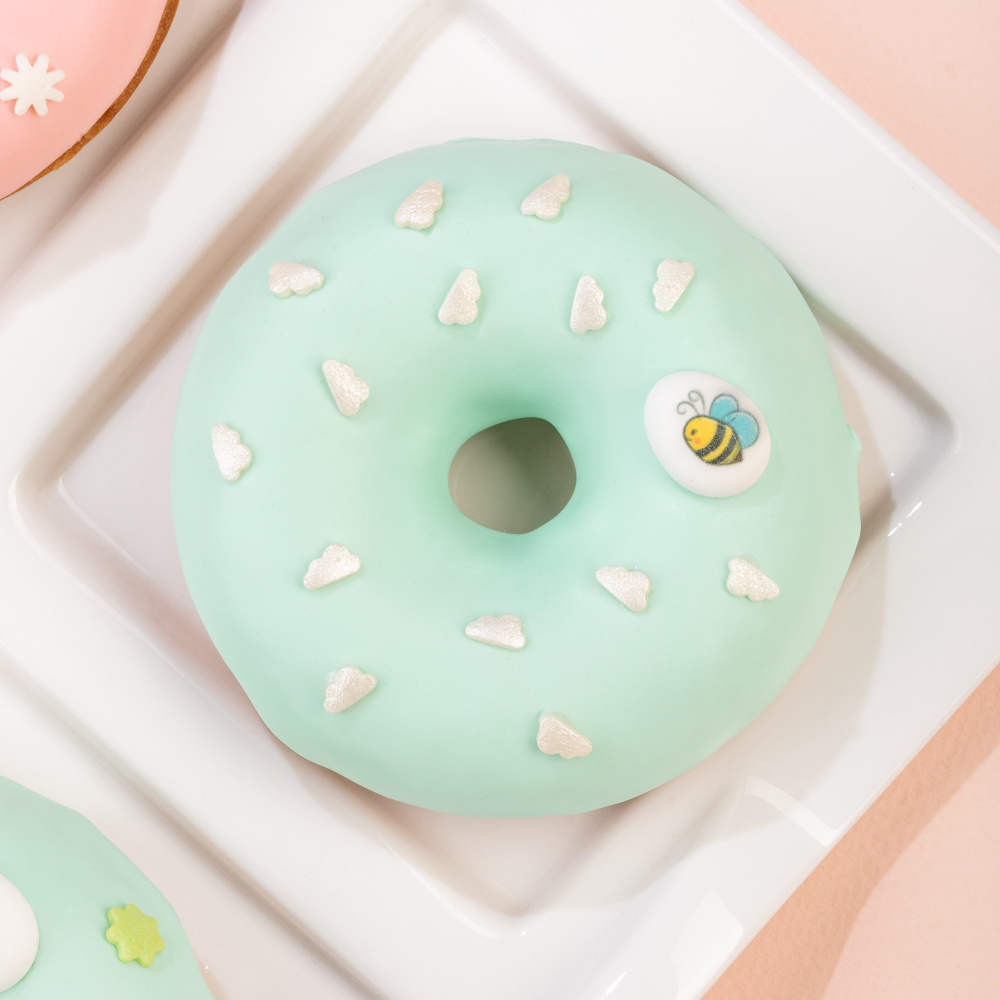 Идея декорирования “Пончики весна” представляет собой мягкий и воздушный десерт в виде пончиков, украшенный помадкой Top Decor в пастельных оттенках “Ванильная мятная” и “Ванильная персиковая”. Для яркого весеннего акцента мы добавили различные посыпки “полевые цветы”, “конфеты пастельные” и “облака белые перламутровые”.