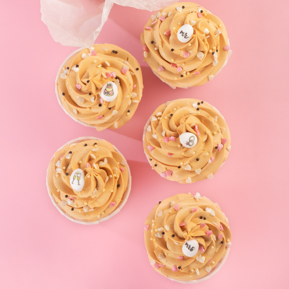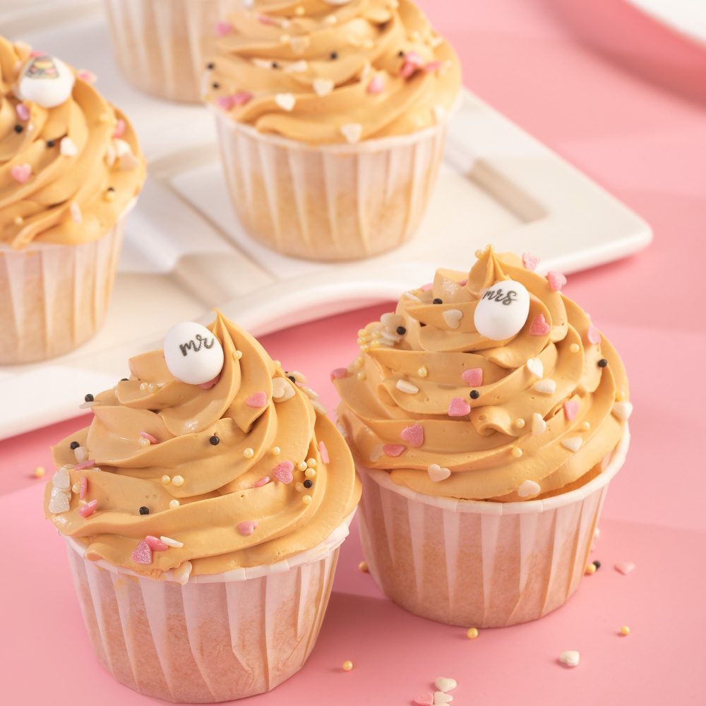 Для окрашивания десертов в нежный цвет крем-брюле мы использовали гелевый водорастворимый краситель в оттенке: “крем-брюле”. Украшены десерты сахарными медальонами “Свадьба, посыпками в виде белых и черных шариков, а также розовыми и белыми перламутровыми сердечками.