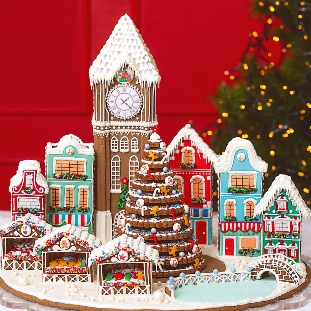 «Пряничная ярмарка» — это эффектная и праздничная композиция из пряников, вдохновлённая атмосферой рождественских ярмарок. Домики, витрины, елочка и часовня, выполненные из ароматного теста, создают целую новогоднюю сказку, которую можно разместить на праздничном столе.