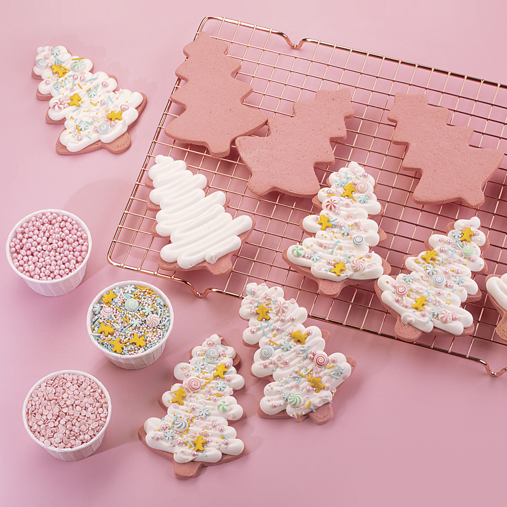 Чтобы получить такой нежный рождественский оттенок мы использовали краситель из зимней коллекции Top Decor “Розовый леденец”. Украсить пряники можно сливочным кремом и ярким миксом посыпок “Сладкое королевство”.
