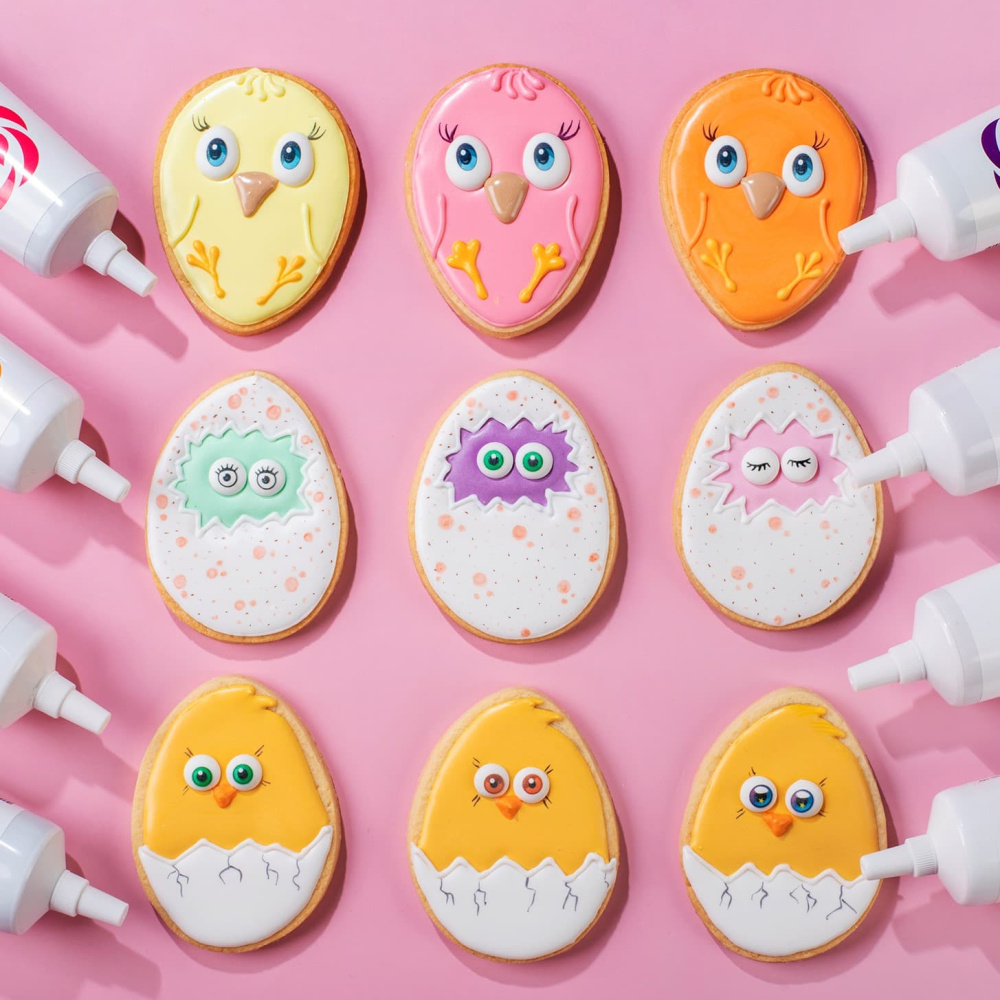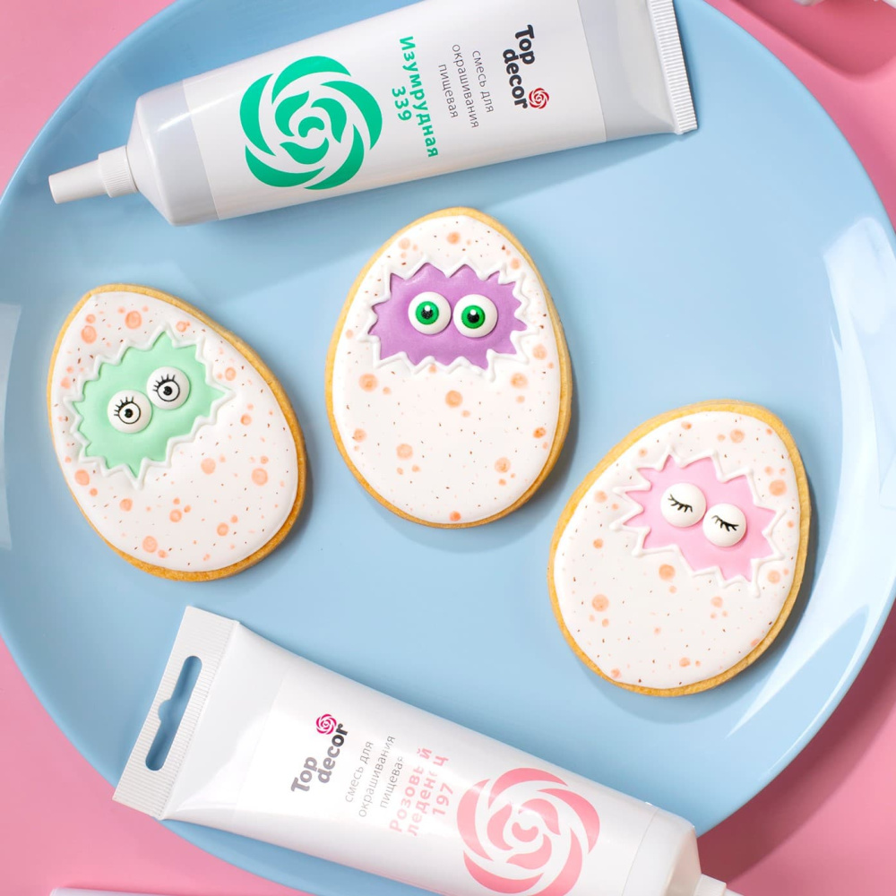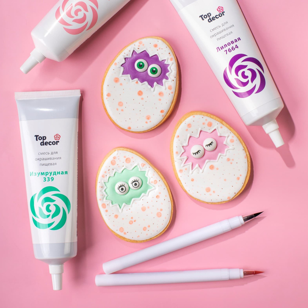 Оригинальная идея декорирования пряников в форме яиц динозавров! Покрытые разноцветной помадкой айсинг, они станут ярким и необычным украшением праздничного стола. Цвета помадки были получены с помощью красителей Топ Декор, а узоры на яйцах были выполнены черным и красным пищевым фломастером. Кроме того, на каждом яйце выглядывает маленький динозаврик, который добавляет игривости и жизненности этой идее. Для создания формы яиц использовалась специальная вырубка, что помогло достичь ровных и аккуратных форм. Попробуйте воплотить эту идею в жизнь и порадуйте своих гостей необычным десертом!