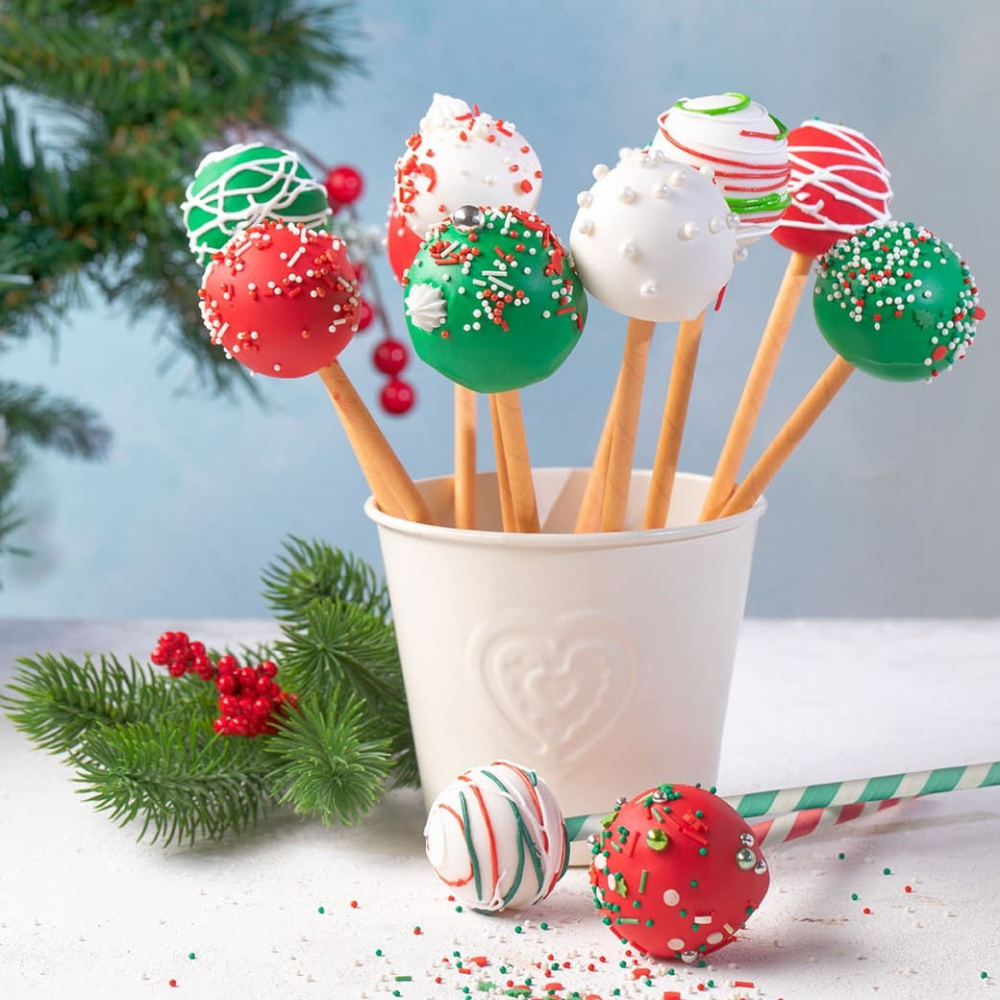 Идея декорирования "Рождественские кейк-попсы" представляет собой кейк-попсы, оформленные в рождественском стиле с использованием красных, белых и зеленых цветов, а также сахарных медальонов с изображением новогодних игрушек и посыпок от Top Decor. На изображении видно, как каждый кейк-попс превращается в маленькую рождественскую композицию. Они украшены сахарными медальонами в форме новогодних игрушек, которые добавляют праздничный акцент и создают атмосферу Рождества. Посыпки от Top Decor дополняют декор, придавая кейк-попсам яркость и уникальный вид. Рождественские кейк-попсы станут великолепным угощением на праздничном столе и прекрасным способом порадовать себя и гостей во время рождественских праздников.