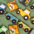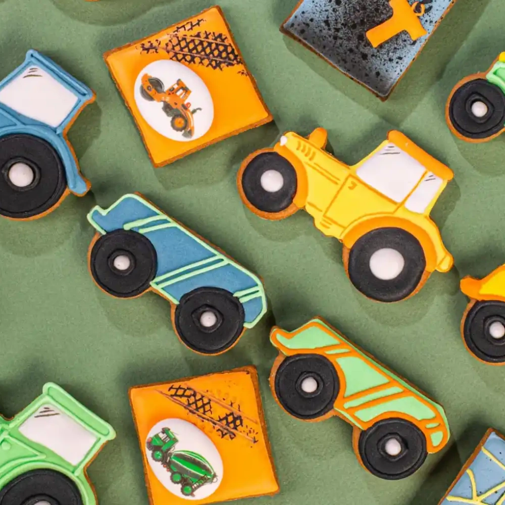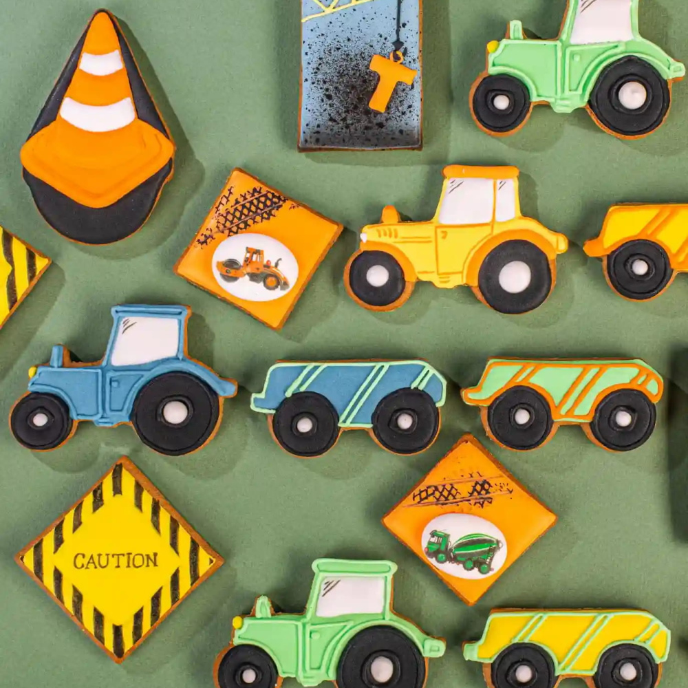 Съедобные трактора, экскаваторы и самосвалы! Каждый пряник в форме строительной техники покрыт ярким айсингом с использованием красителей Top Decor, включая желтый, синий и неоново-зеленый. Эти вкусные и красочные пряники сделают любую вечеринку или детский праздник ярким и запоминающимся. Вы можете использовать их как украшение для торта или просто подарить в качестве сладкого подарка. Некоторые пряники также украшены сахарными медальонами "Строительная техника" от компании Top Decor, что добавляет дополнительную изюминку этому веселому лакомству.