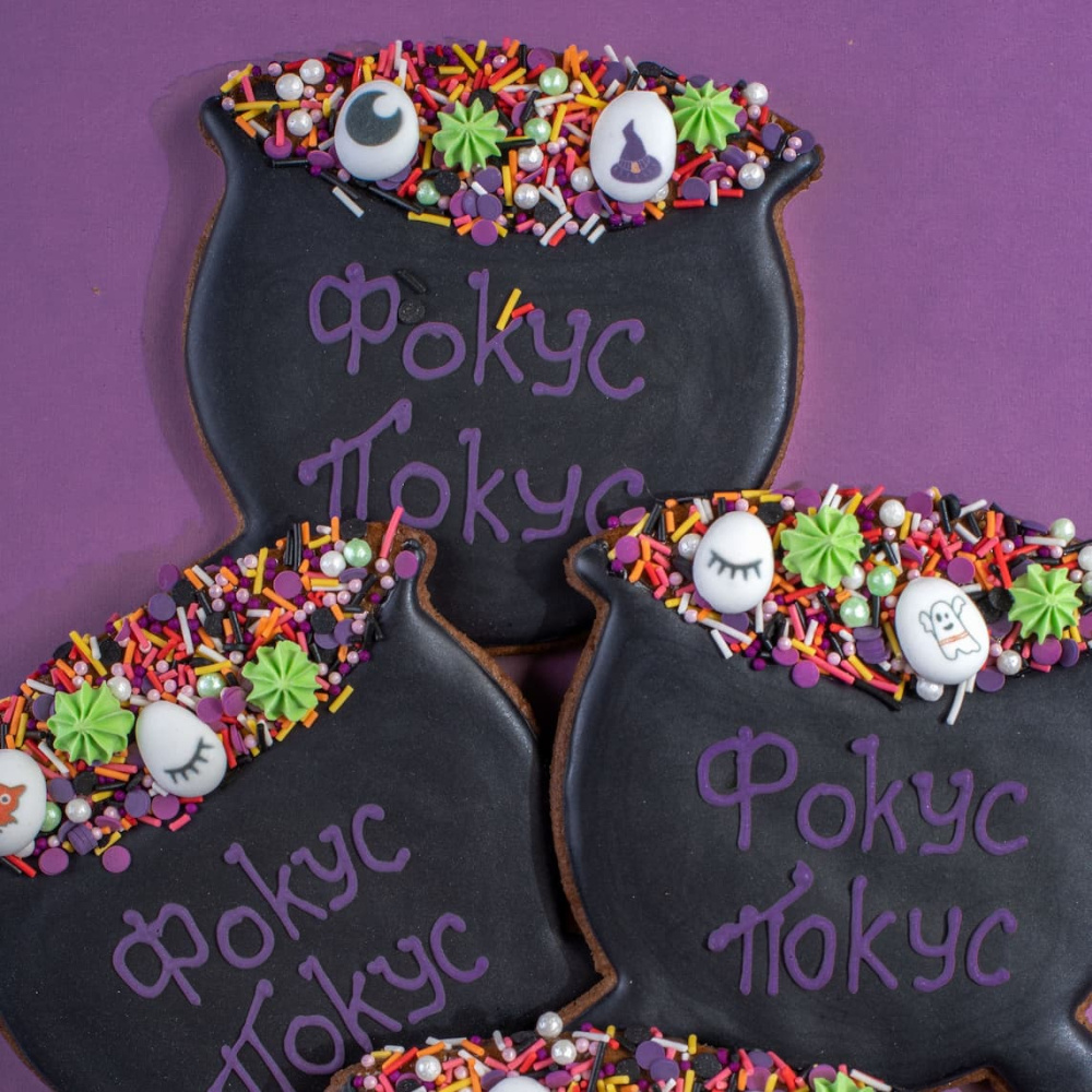 Идея декорирования "Сладкие котелки" представляет собой пряники, выполненные в форме котелков, наполненных зельем. Зелье визуально реализовано с помощью множества посыпок от компании Top Decor, которые создают разнообразные цвета и текстуры, придавая котелкам загадочность и волшебство. Этот декоративный элемент станет ярким акцентом на праздничном столе или в сладком буфете, внося атмосферу волшебства и фантазии. Сладкие котелки являются привлекательным и уникальным угощением для любителей волшебства и сладостей.