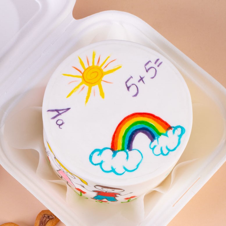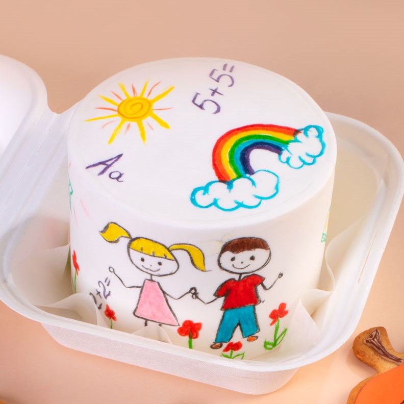 Идея декорирования "Торт к школе" представляет собой бенто-торт, выполненный в белом цвете и украшенный пищевыми фломастерами Top Decor. На торте изображены мальчик и девочка на полянке, а также сверху расположены солнышко и радуга. Этот декоративный элемент добавляет особый школьный и радостный настрой к торту, что делает его отличным вариантом для празднования начала учебного года, окончания школы или других школьных событий.