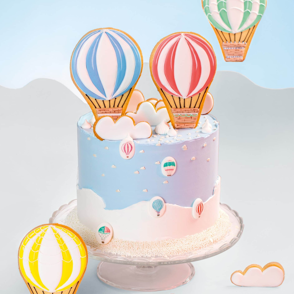 Идея декорирования "Торт "Небо и Воздушные шары"" представляет собой торт, который имитирует небо с воздушными шарами. Основа торта окрашена в голубой цвет, создавая впечатление небесной глубины. Внизу торта находятся пушистые облака, а вдоль периметра размещены сахарные медальоны с изображением воздушных шаров. На верхушке торта расположены пряники, выполненные в виде воздушных шаров. Каждый элемент торта, включая основу, облака и пряники, окрашены с использованием фирменных пищевых красителей от компании Top Decor. Эта декоративная композиция создает атмосферу легкости и веселья, принося радость на любой праздник.