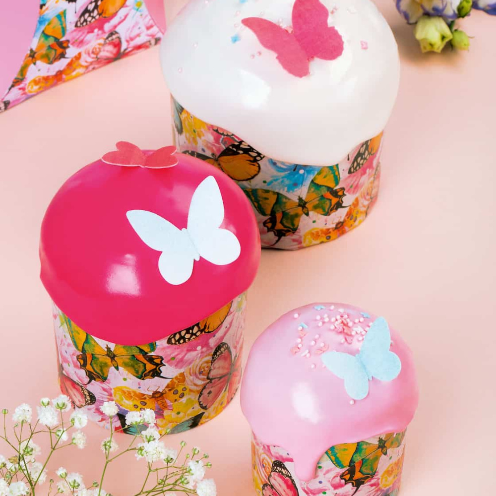Кроме того, каждый кулич украшен цветными вафельными бабочками, которые добавляют еще больше яркости и игривости в эту идею. Куличи подаются в коробке в едином стиле, что делает их идеальным подарком для праздничного стола или для дарения близким.
