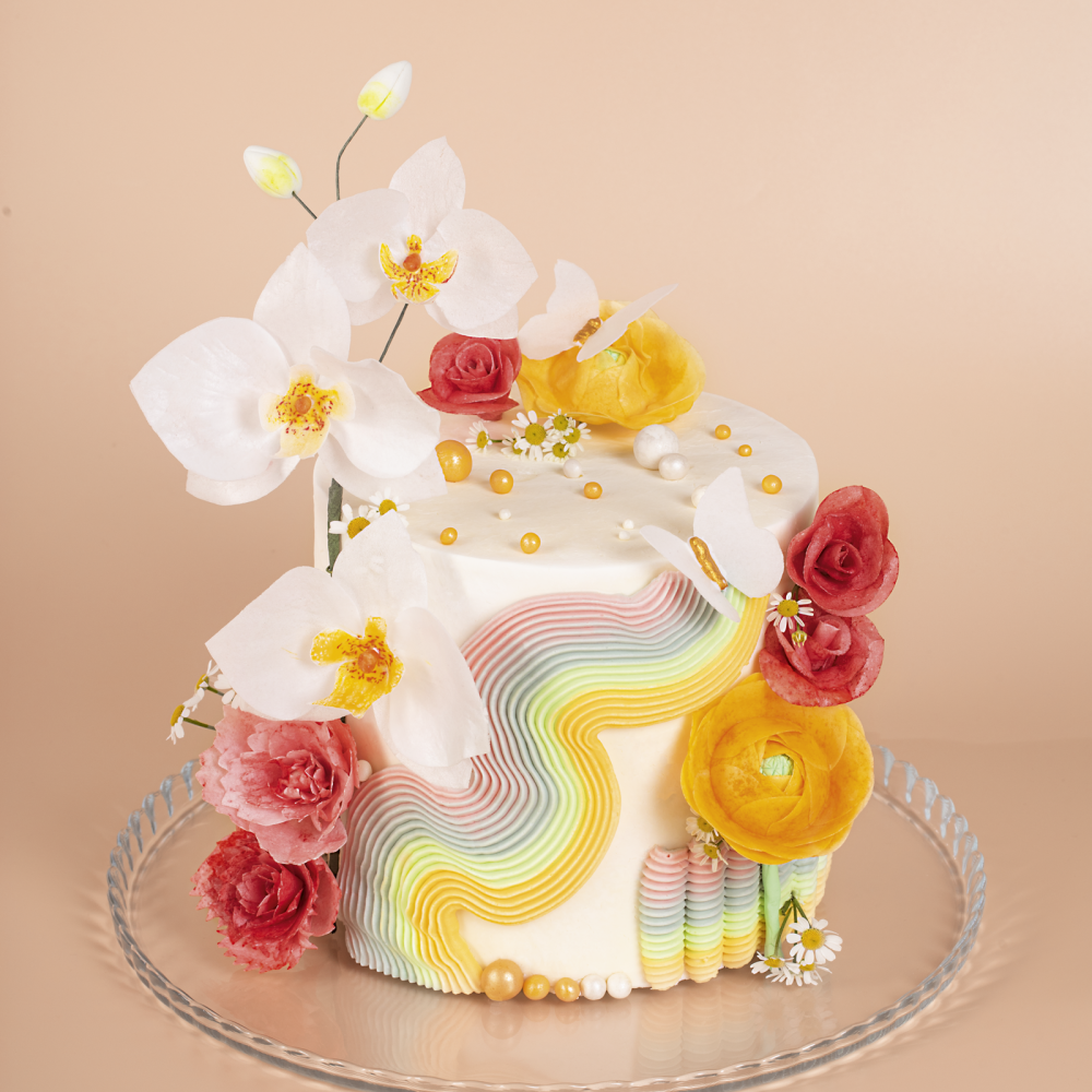Торт украшен волнообразным декором в пастельных тонах с помощью насадки Top Decor “Дорожка”. Цветочная композиция из декоративных элементов придаёт десерту изысканный вид, а жемчужные акценты в виде золотого микса завершают образ. Этот торт — визуальное и вкусовое воплощение летнего настроения.