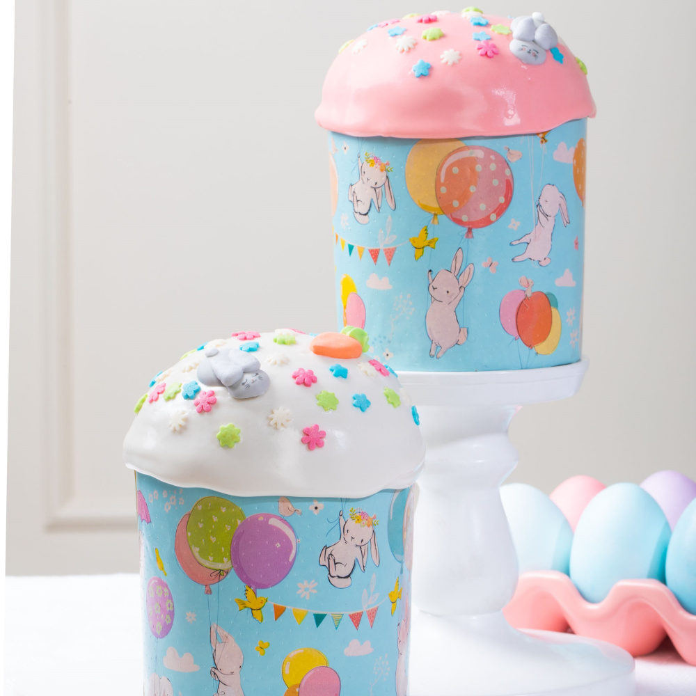 Представляем вам новую идею от компании кондитерского декора "Top Decor" - "Зайцы на шарах". Главным элементом этой идеи является куличная форма с изображением забавных зайцев, летящих на шариках. Этот необычный десерт не только удивит своим внешним видом, но и порадует своим вкусом. Куличи в идее покрыты белой, голубой и розовой помадкой и украшены разнообразными посыпками в форме зайчиков и разноцветных яиц, что делает их еще более привлекательными.
